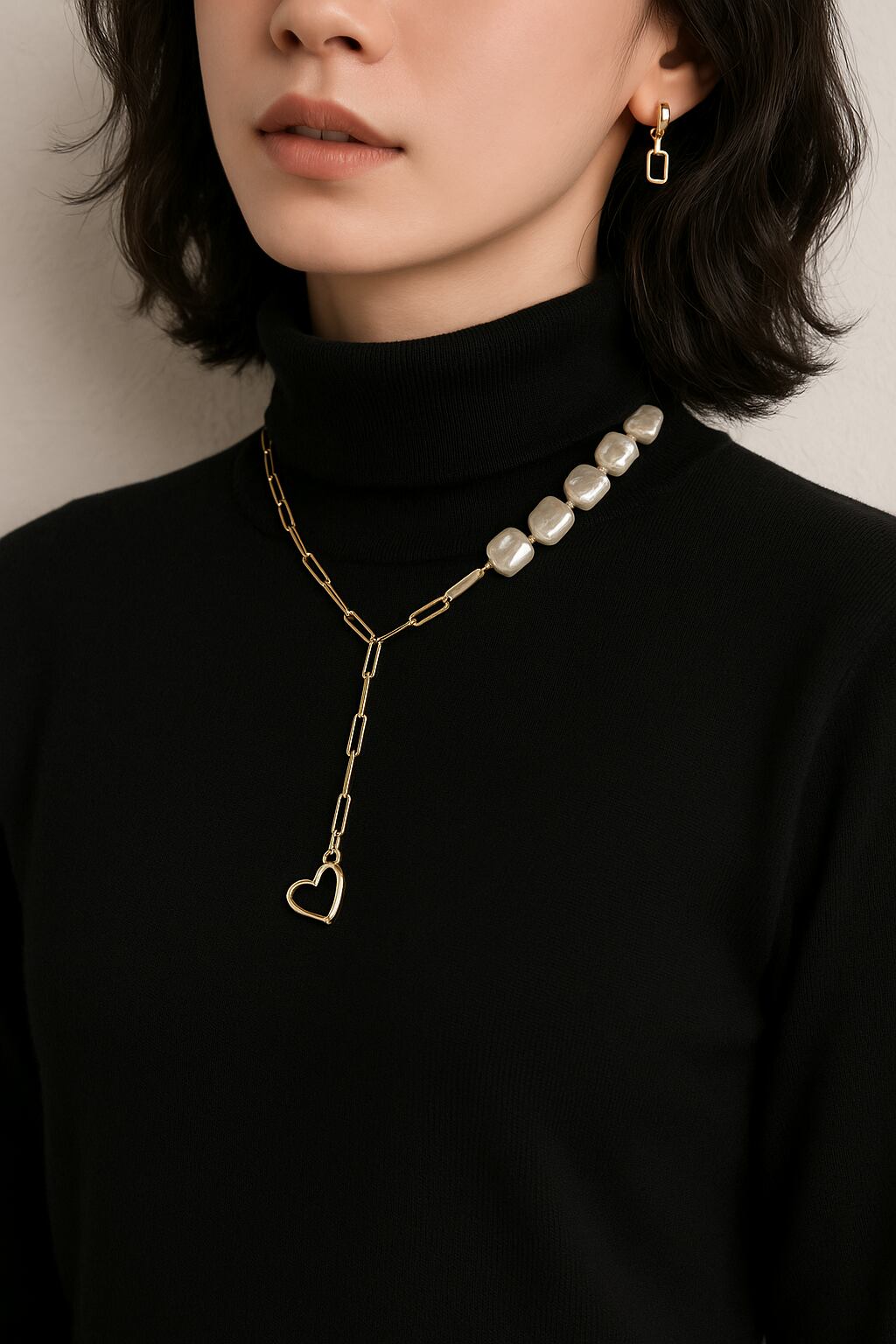 オープンハートチェーンネックレス ステンレレス バロックパール オープンハート Y字
