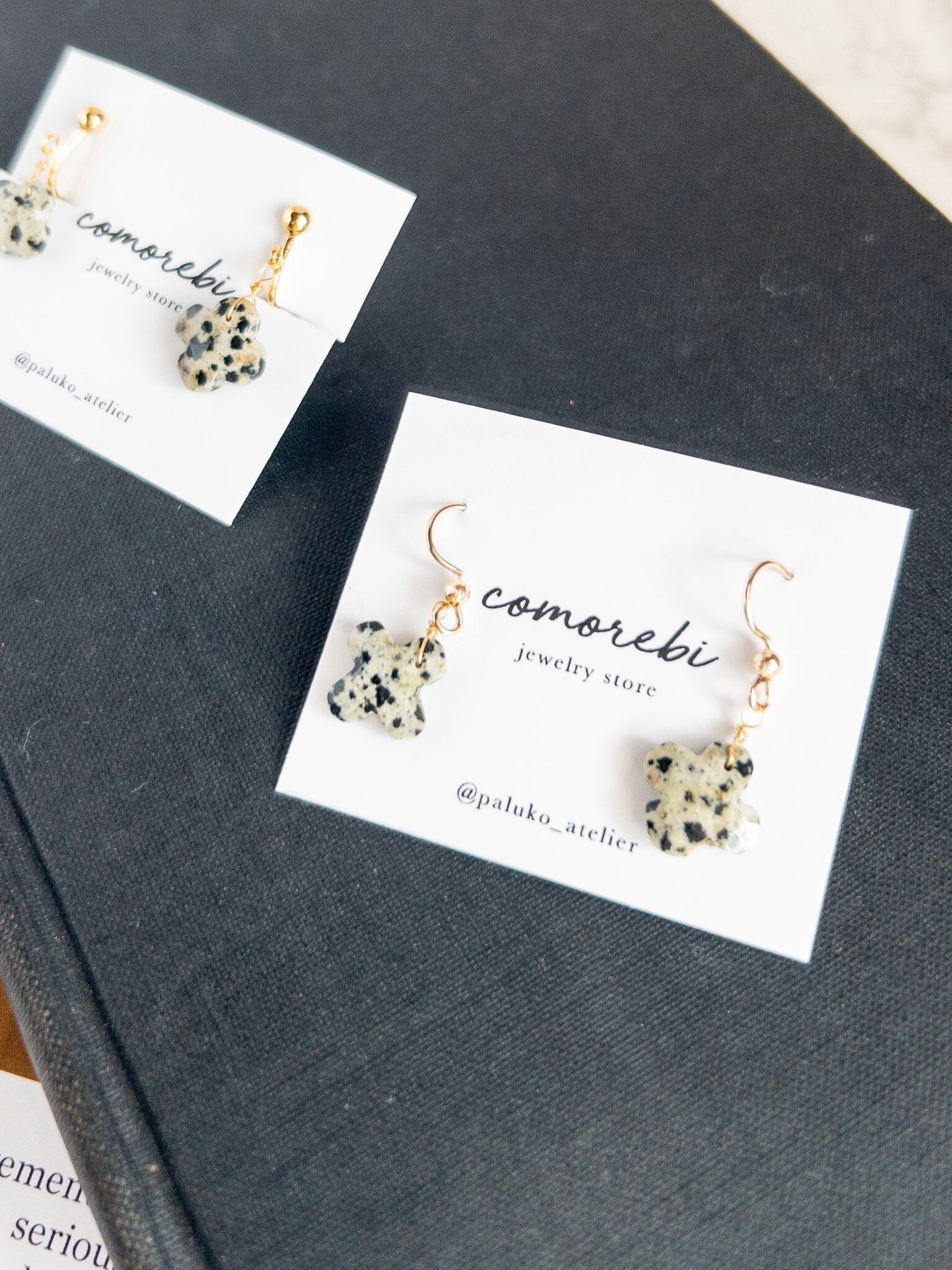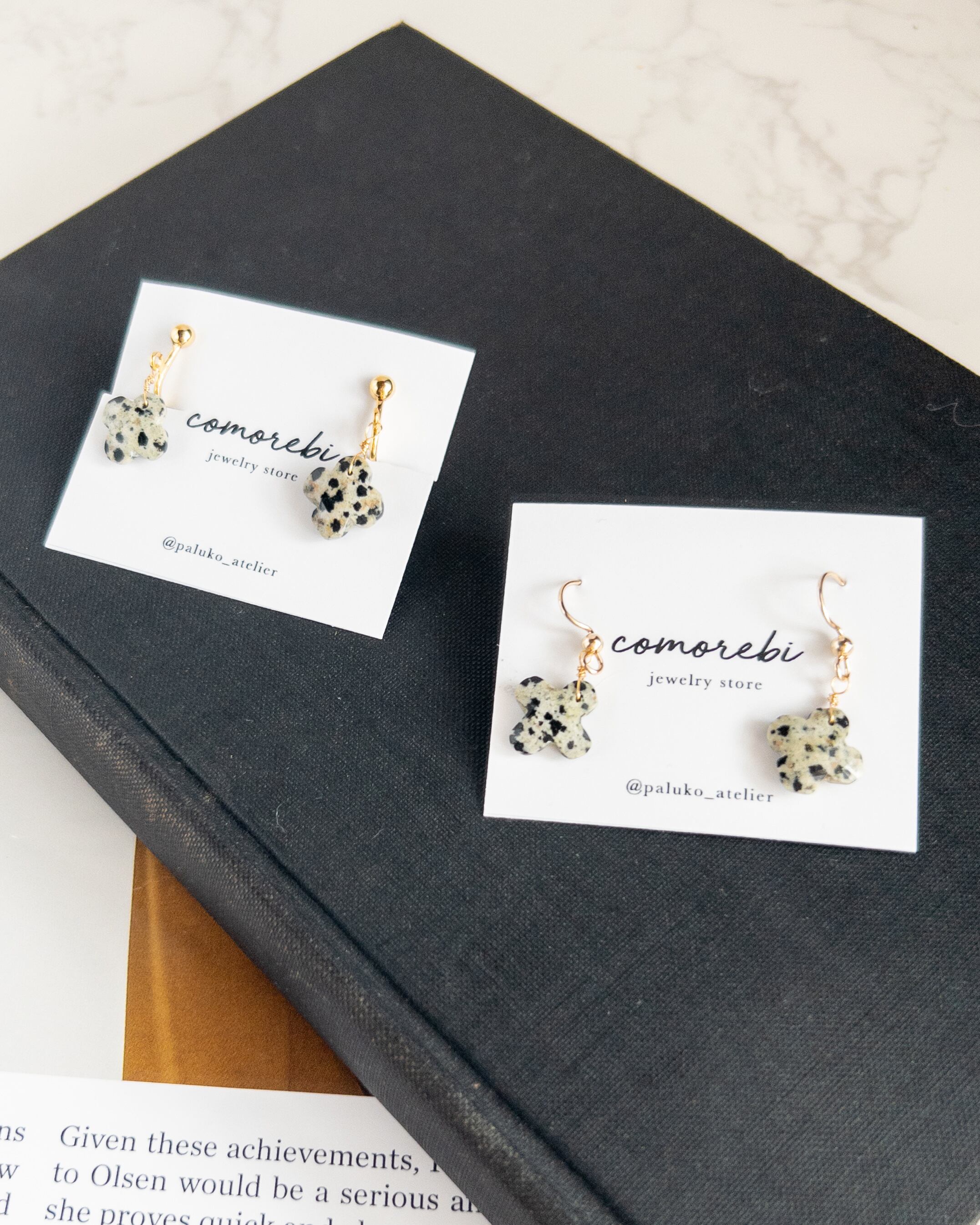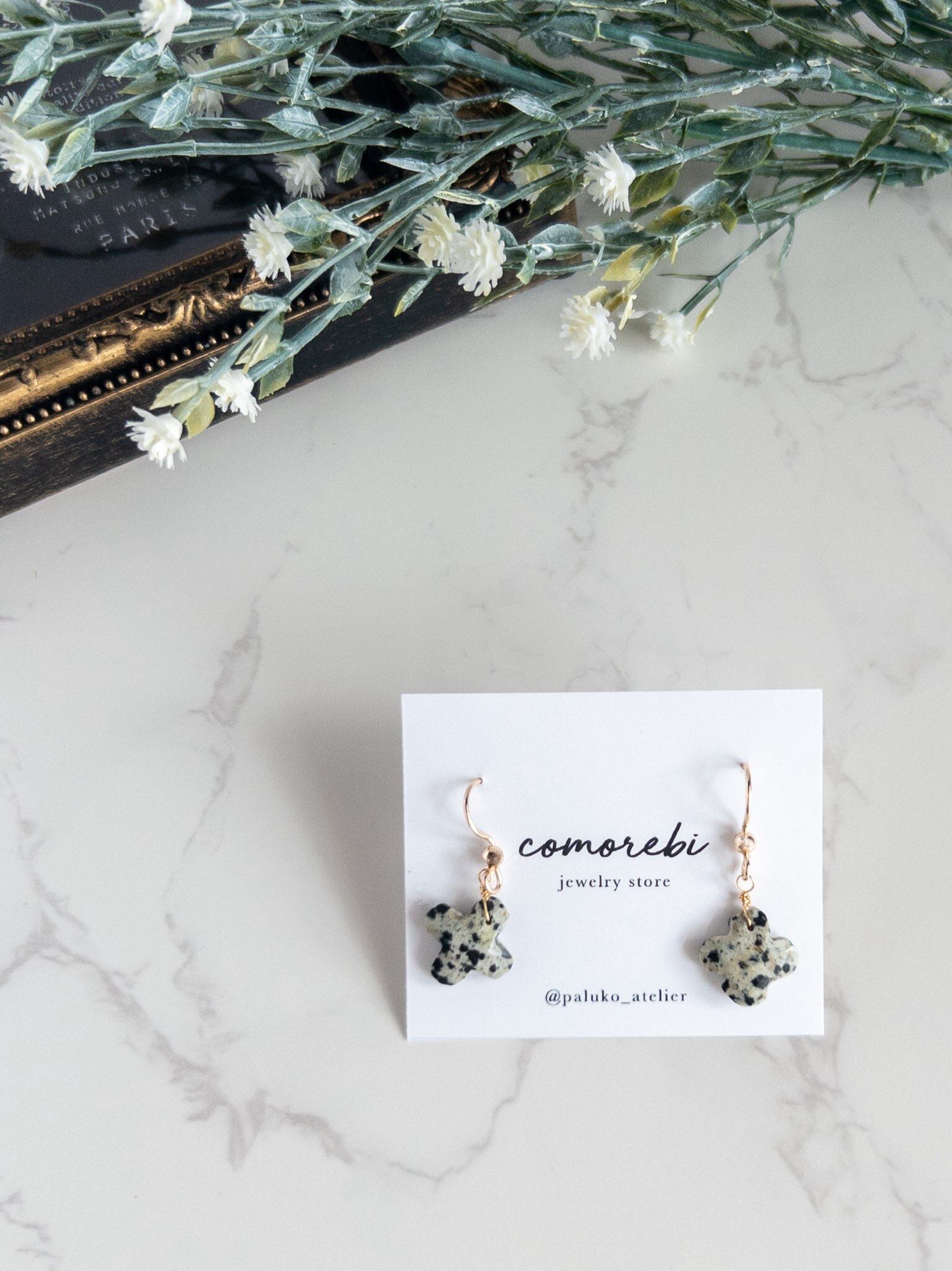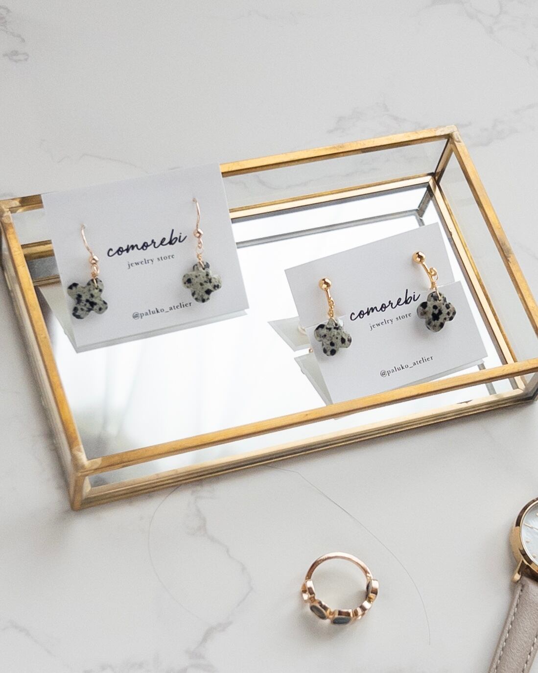 ぽってりとしたフォルムが可愛らしい、クローバー(フラワーカット)型のダルメシアンジャスパーを主役にしたピアスです。