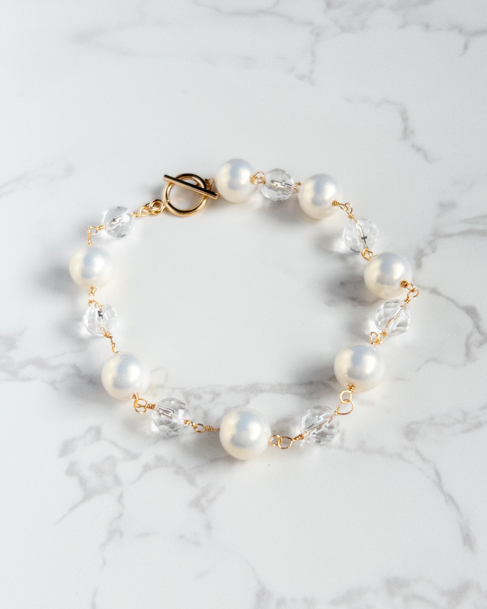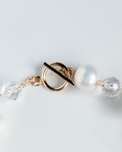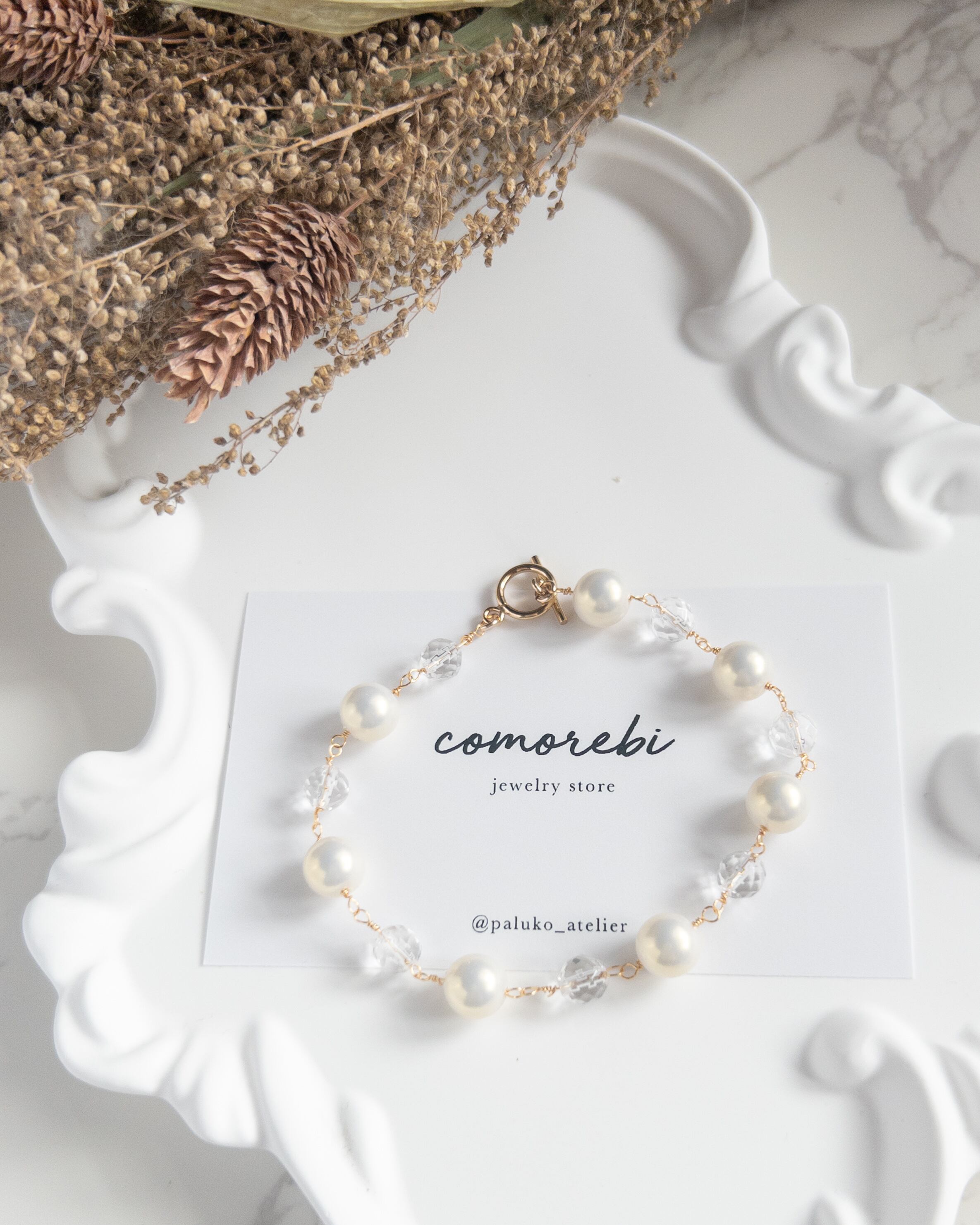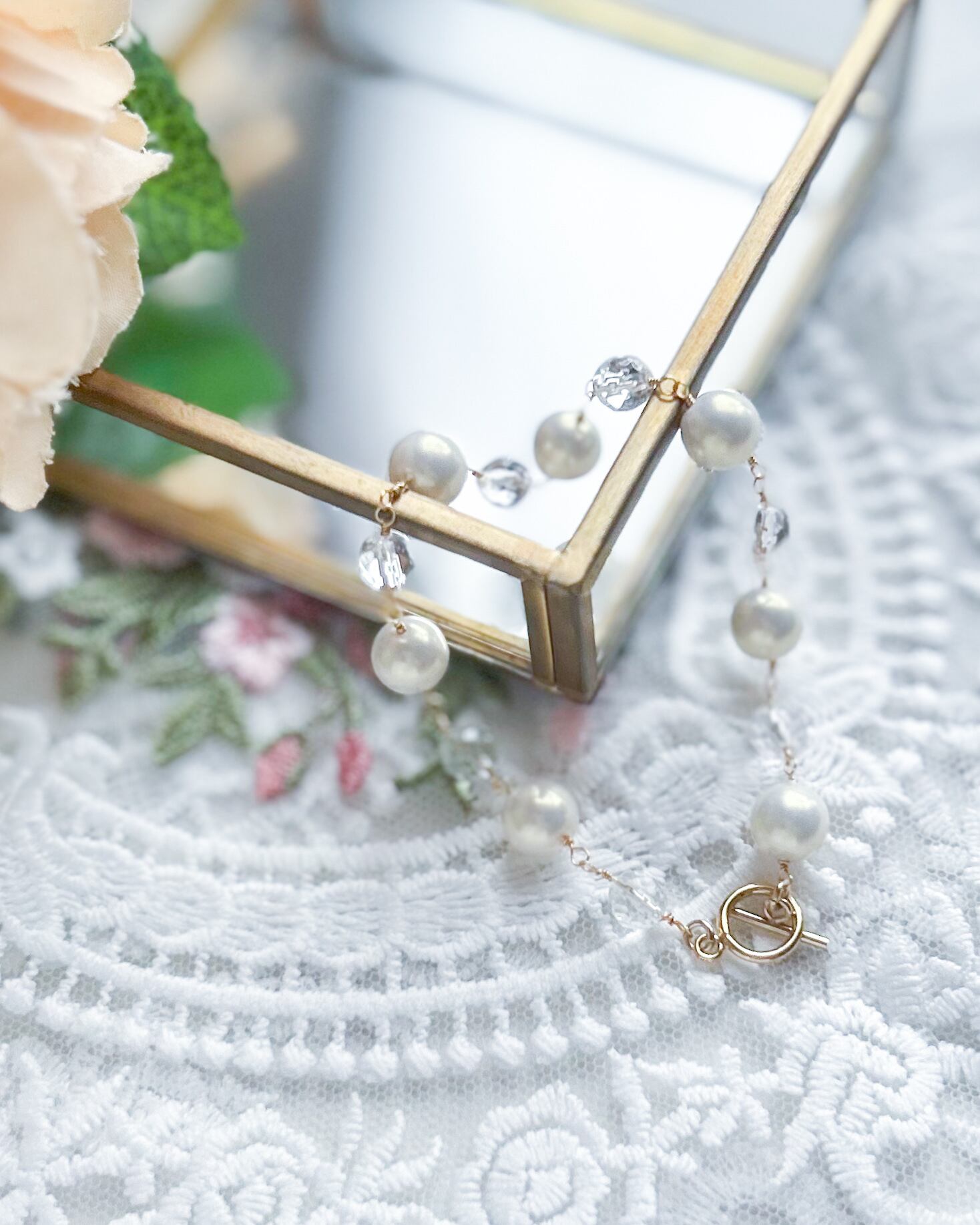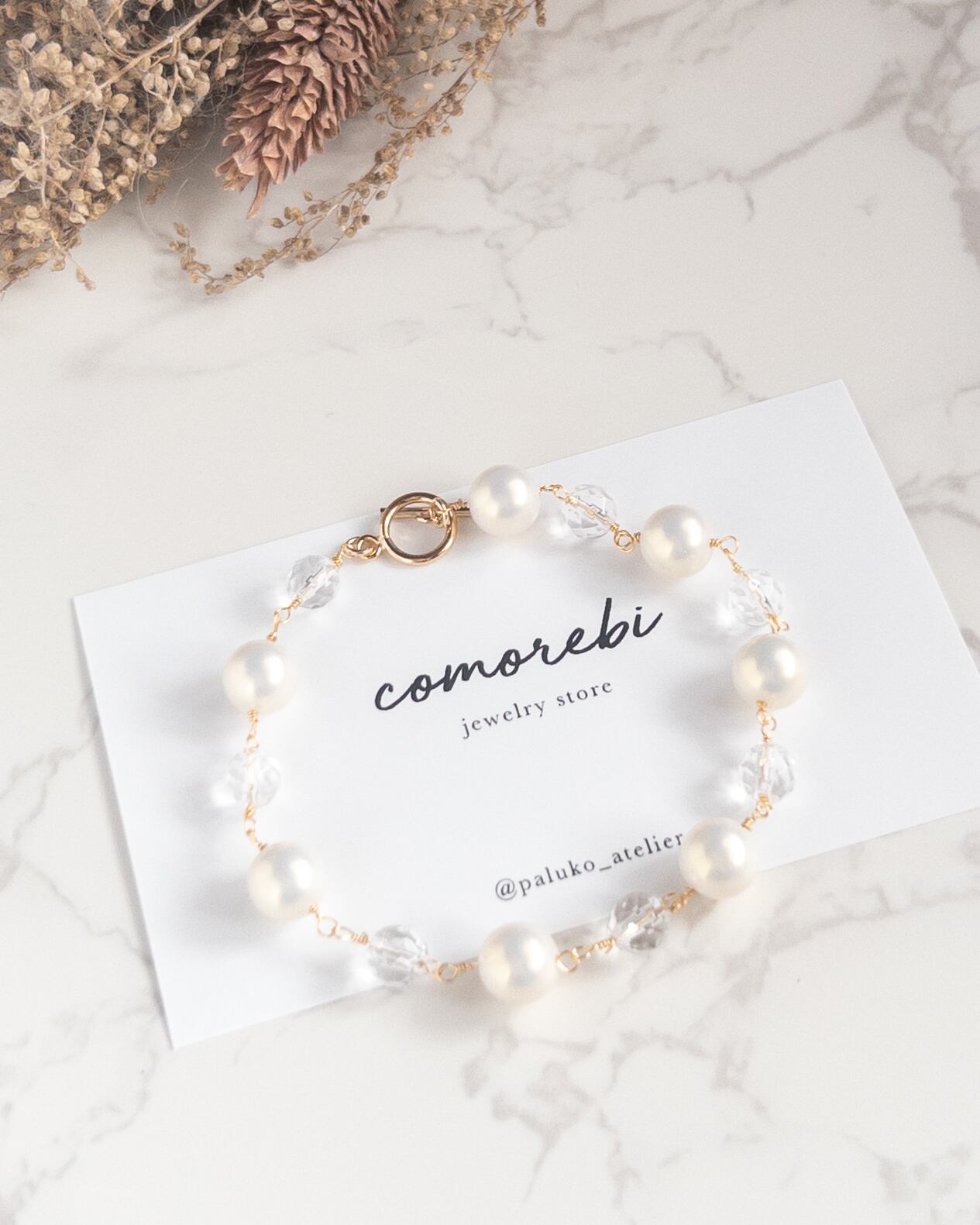 やわらかな色合いなシルキーパールと、澄んだ輝きを持つ**天然石・水晶(ラウンドカット)**をつなぎ合わせた、軽やかで上品なブレスレット。