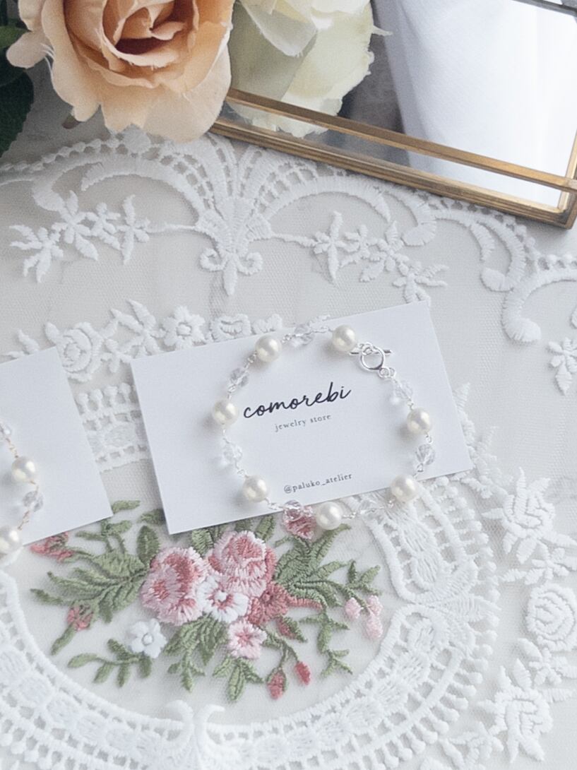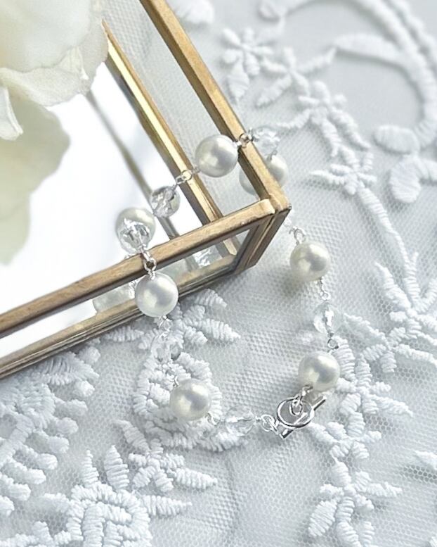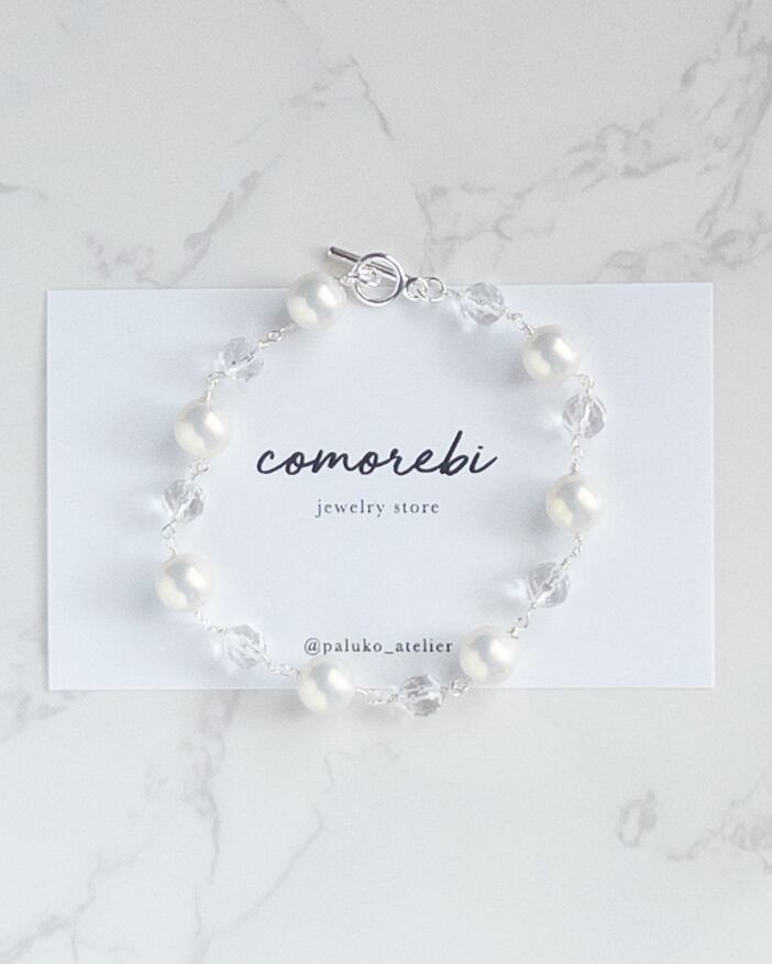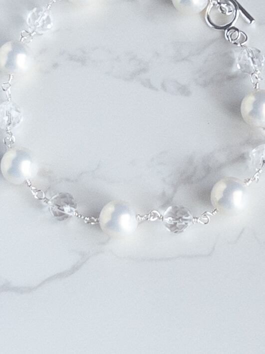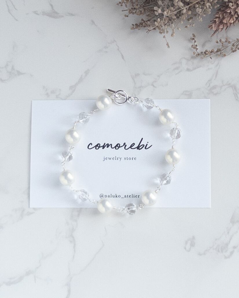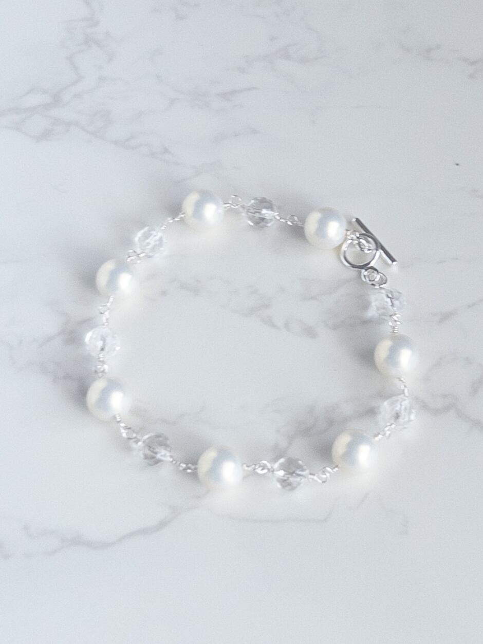 やわらかな色合いなシルキーパールと、澄んだ輝きを持つ**天然石・水晶(ラウンドカット)**をつなぎ合わせた、軽やかで上品なブレスレット。