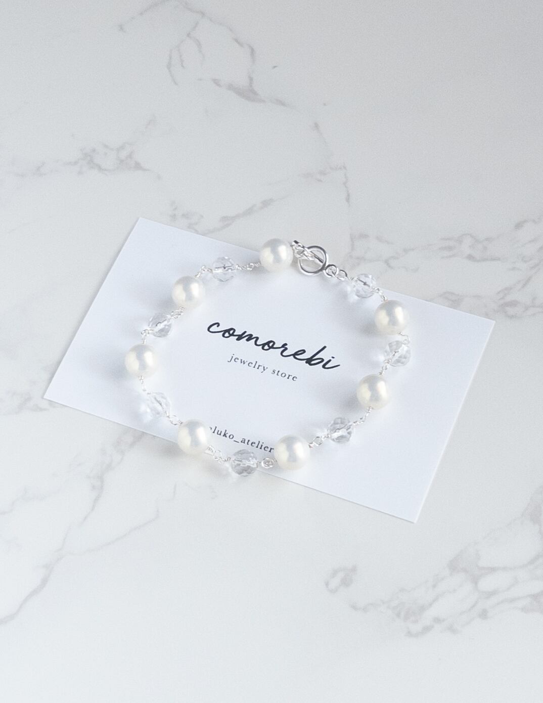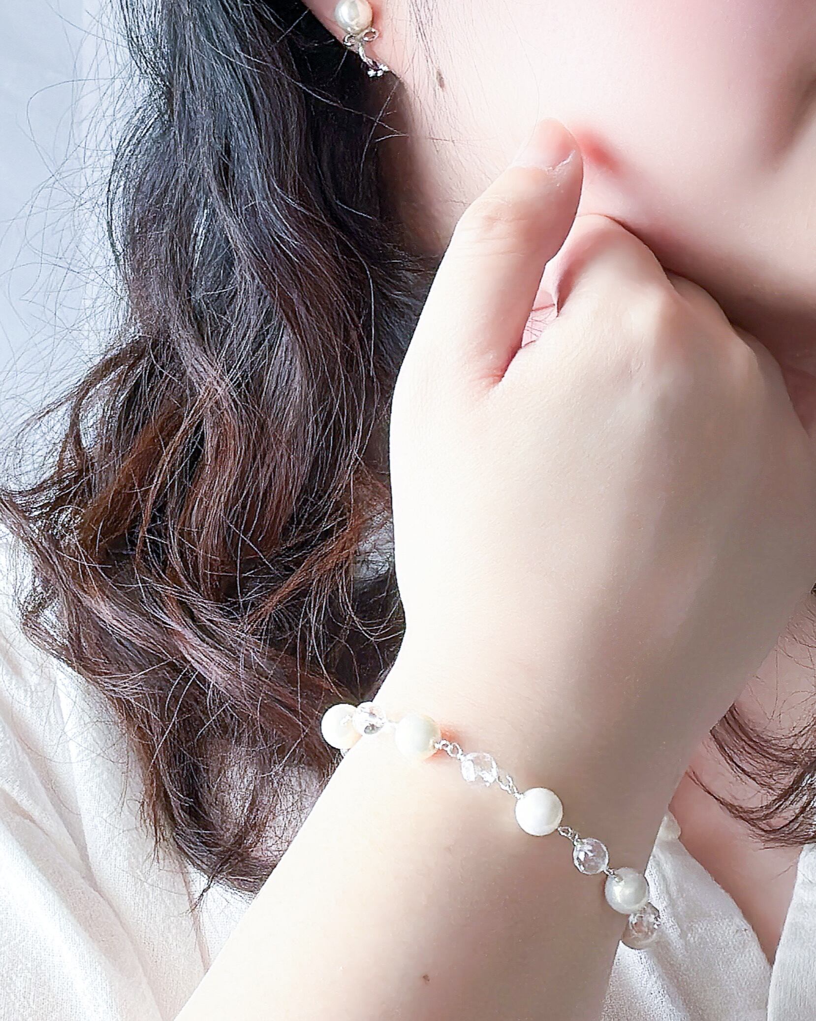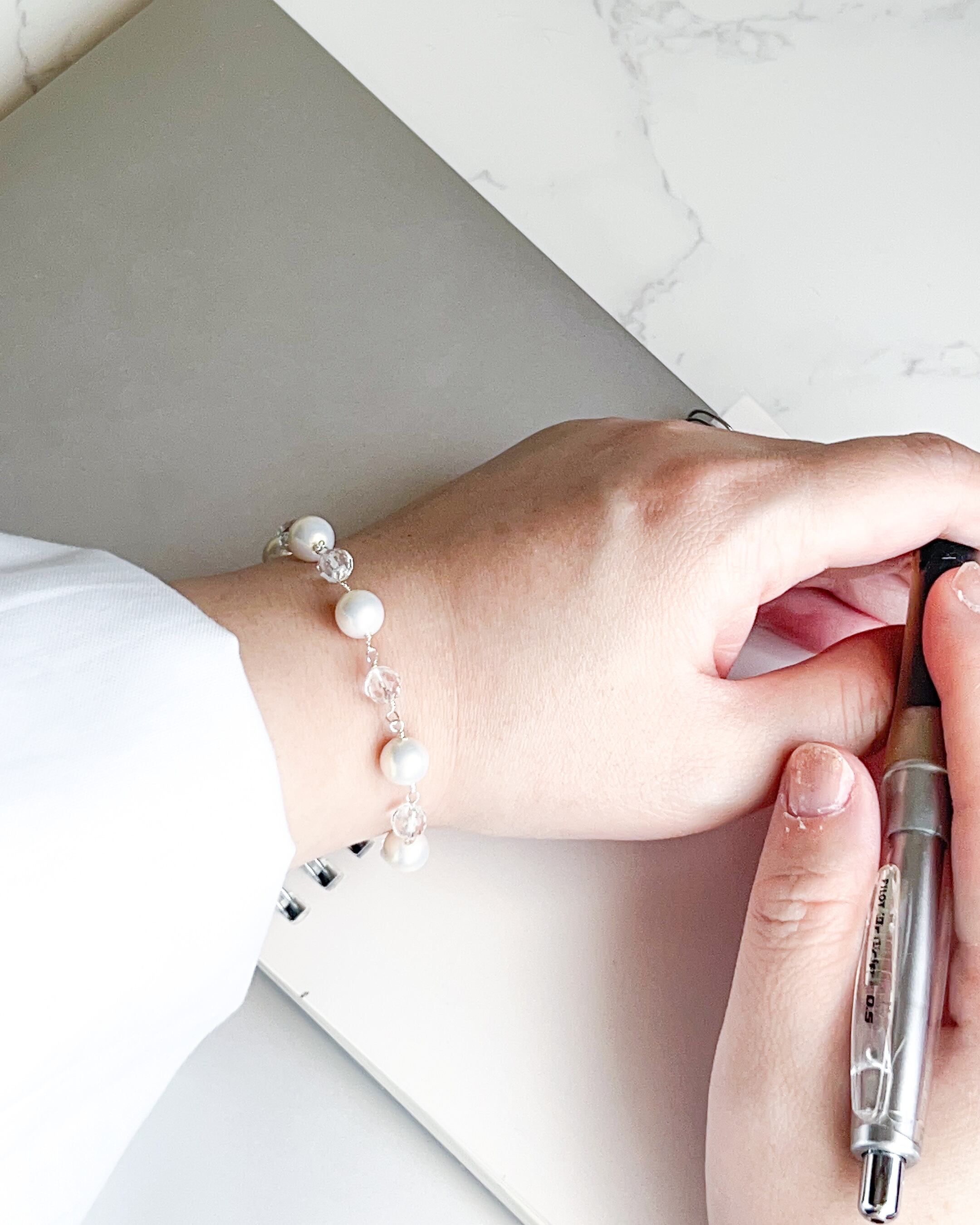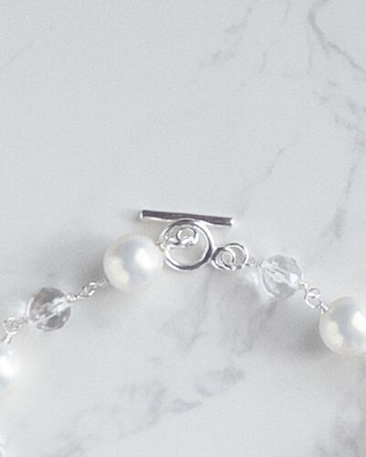 やわらかな色合いなシルキーパールと、澄んだ輝きを持つ**天然石・水晶(ラウンドカット)**をつなぎ合わせた、軽やかで上品なブレスレット。