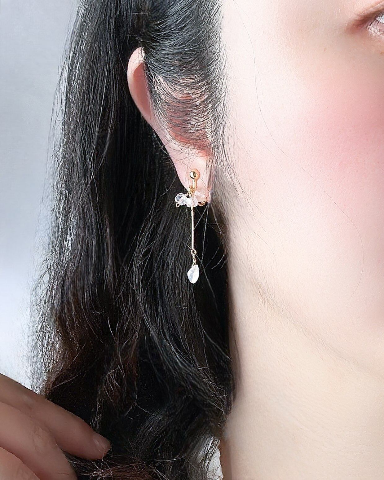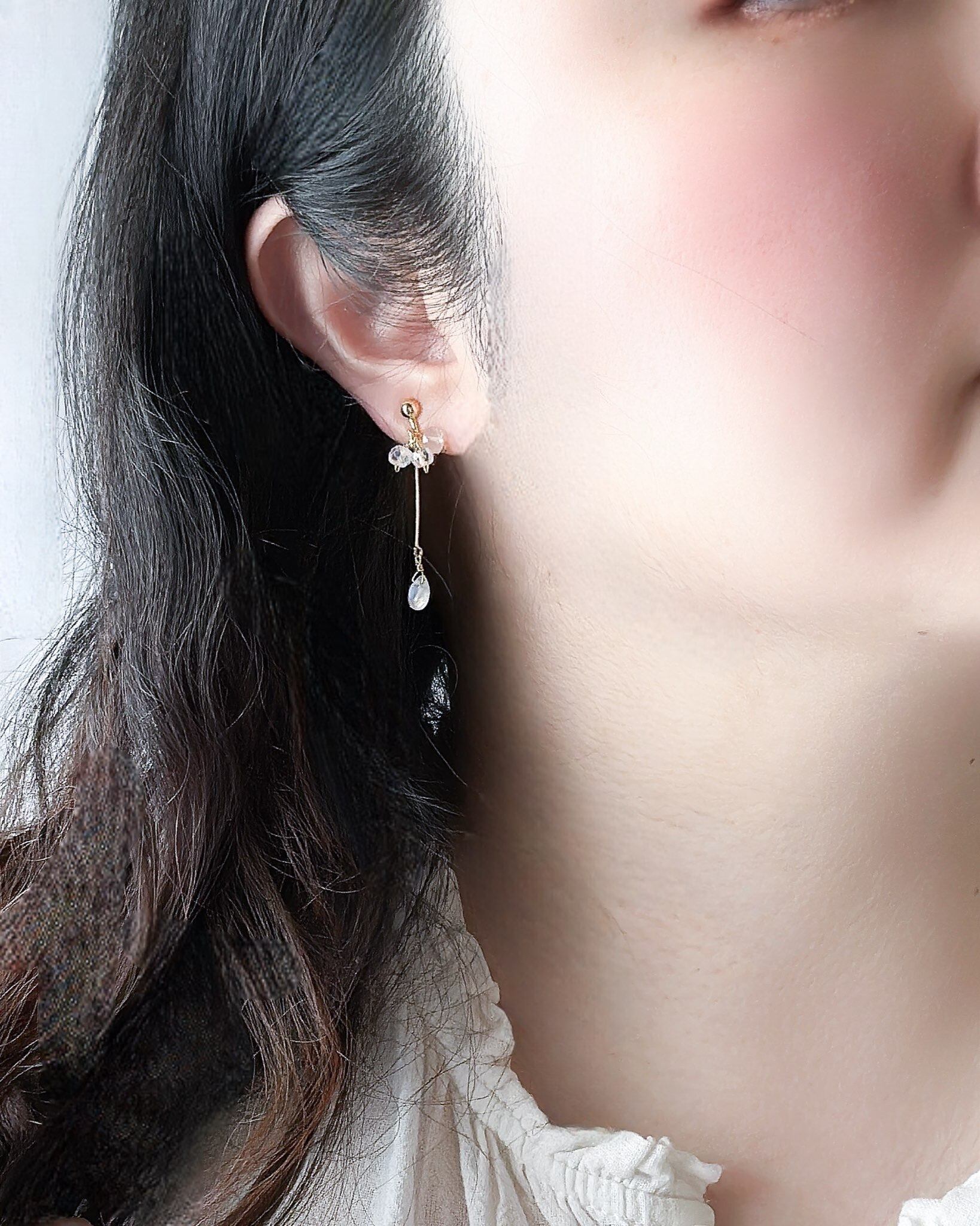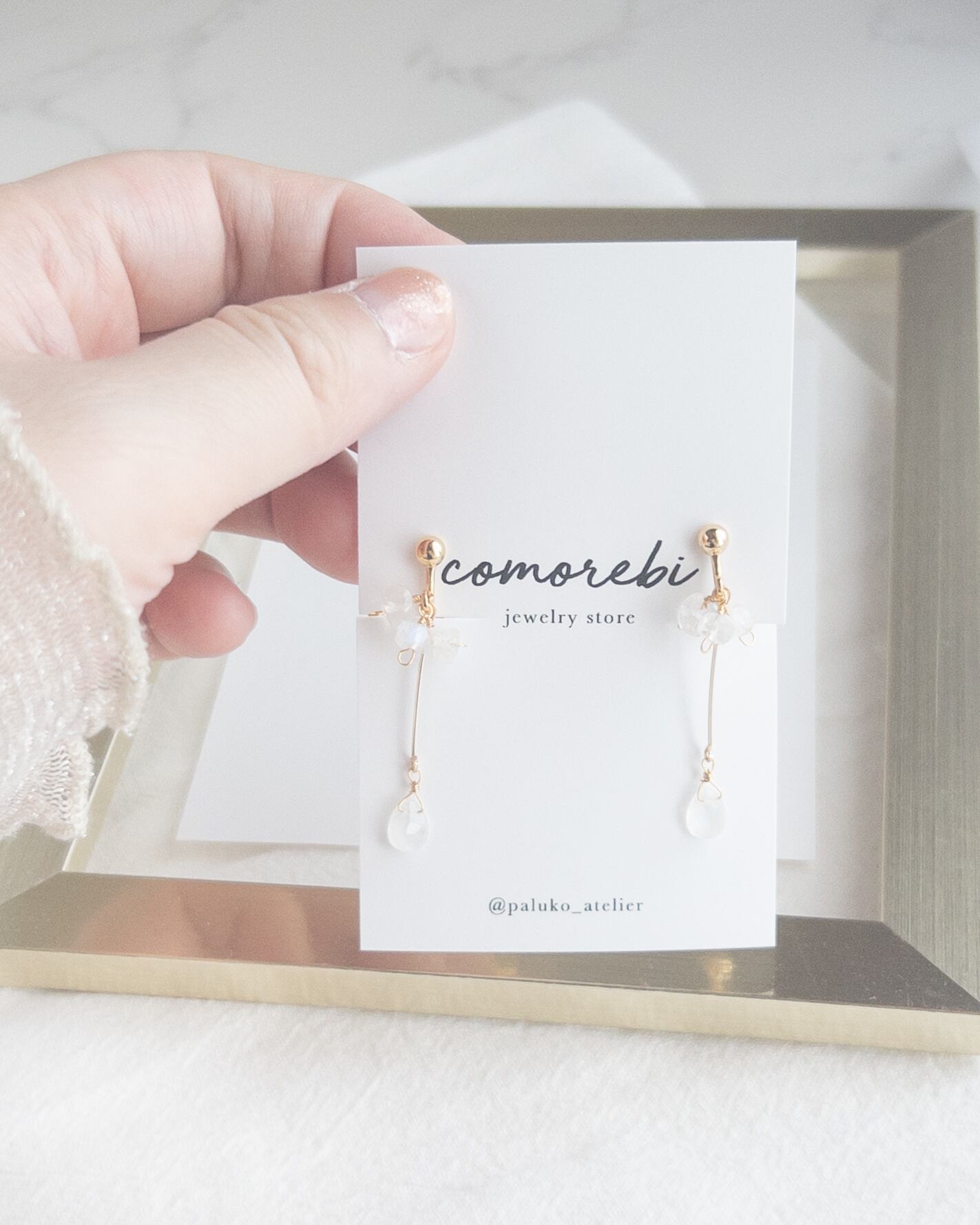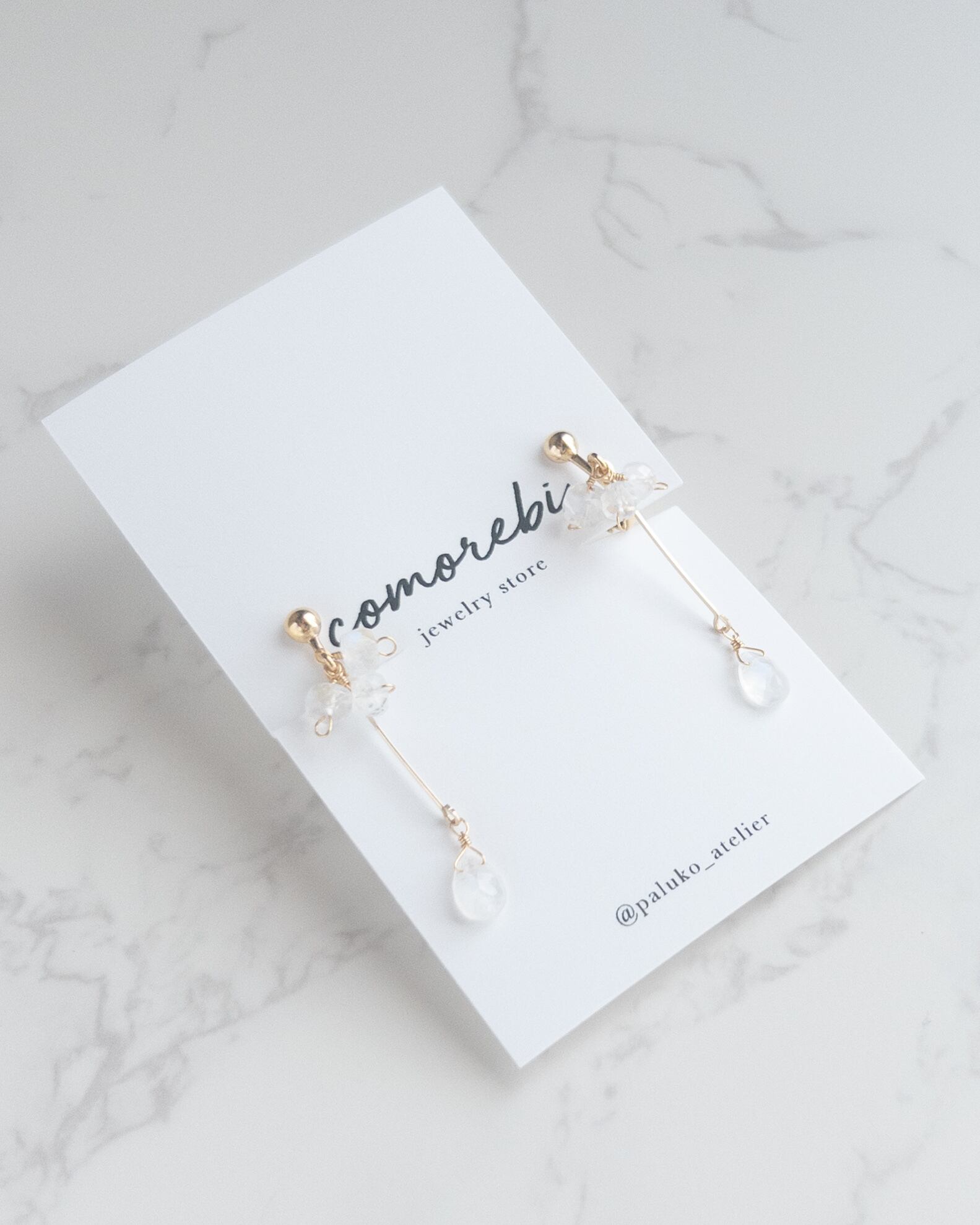 透明感のある雫天然石に、繊細なボタンカットを合わせて、華奢な14kgfワイヤーで丁寧に仕上げました。
