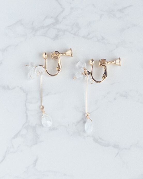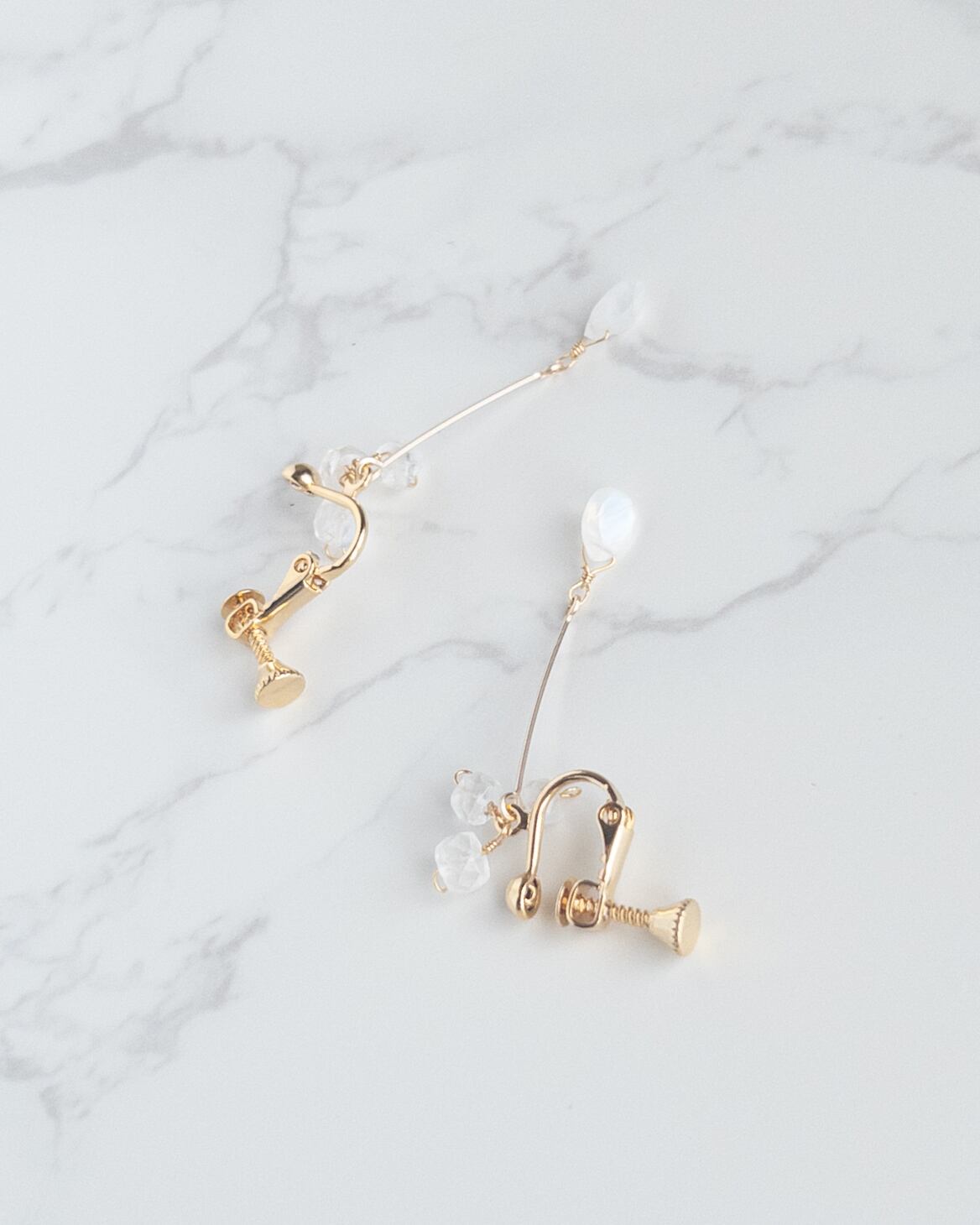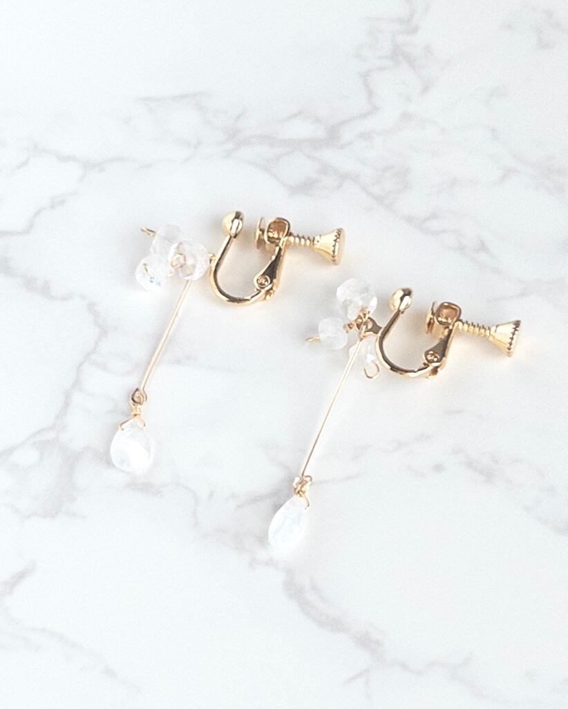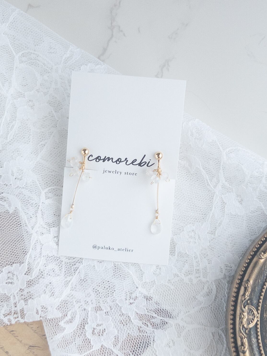 透明感のある雫天然石に、繊細なボタンカットを合わせて、華奢な14kgfワイヤーで丁寧に仕上げました。