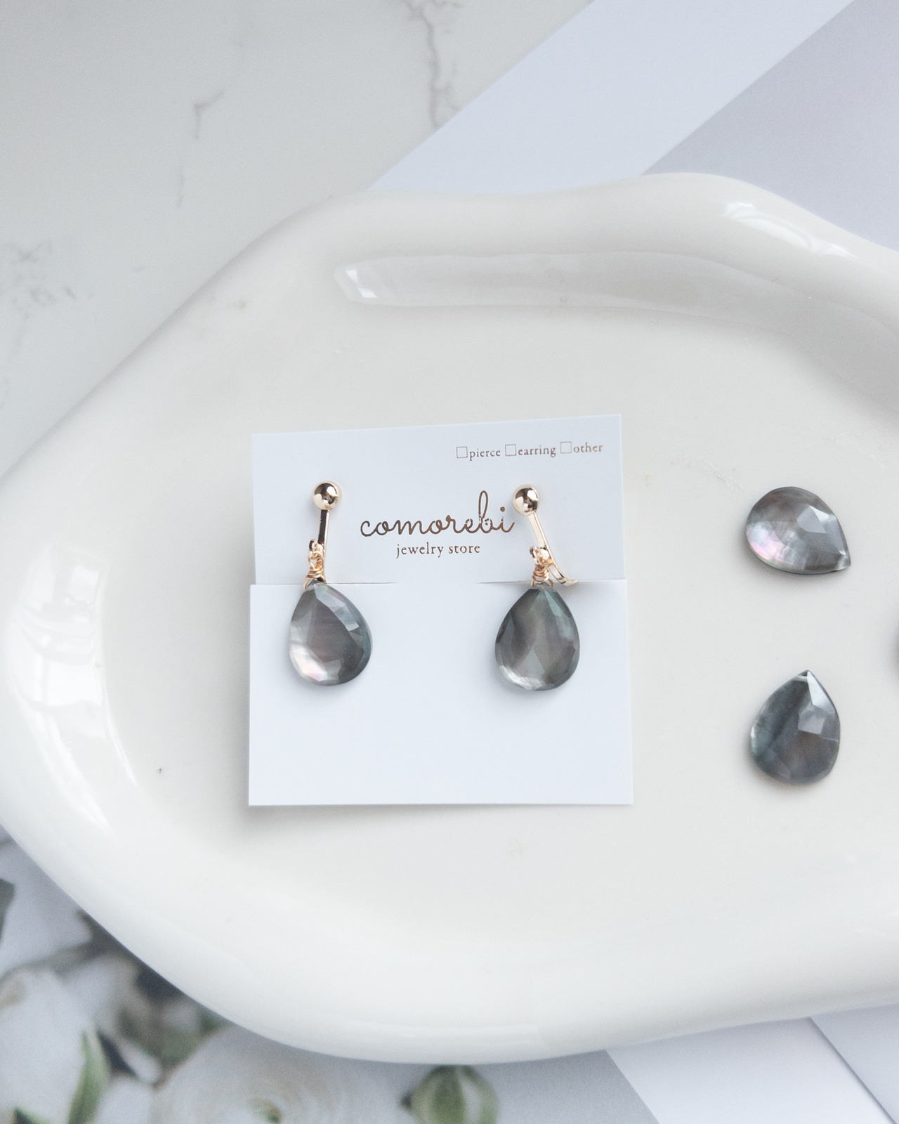 素材 │ ブラックシェル(黒蝶貝)×クリスタル(ダブレット)、14kgfワイヤー、14kgfイヤリング