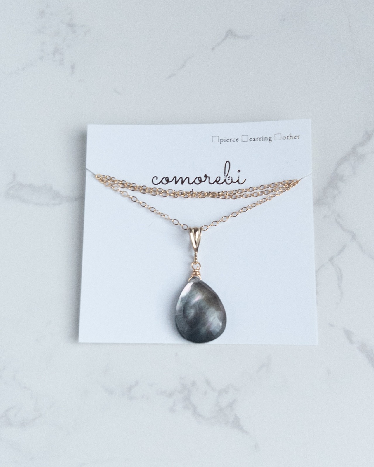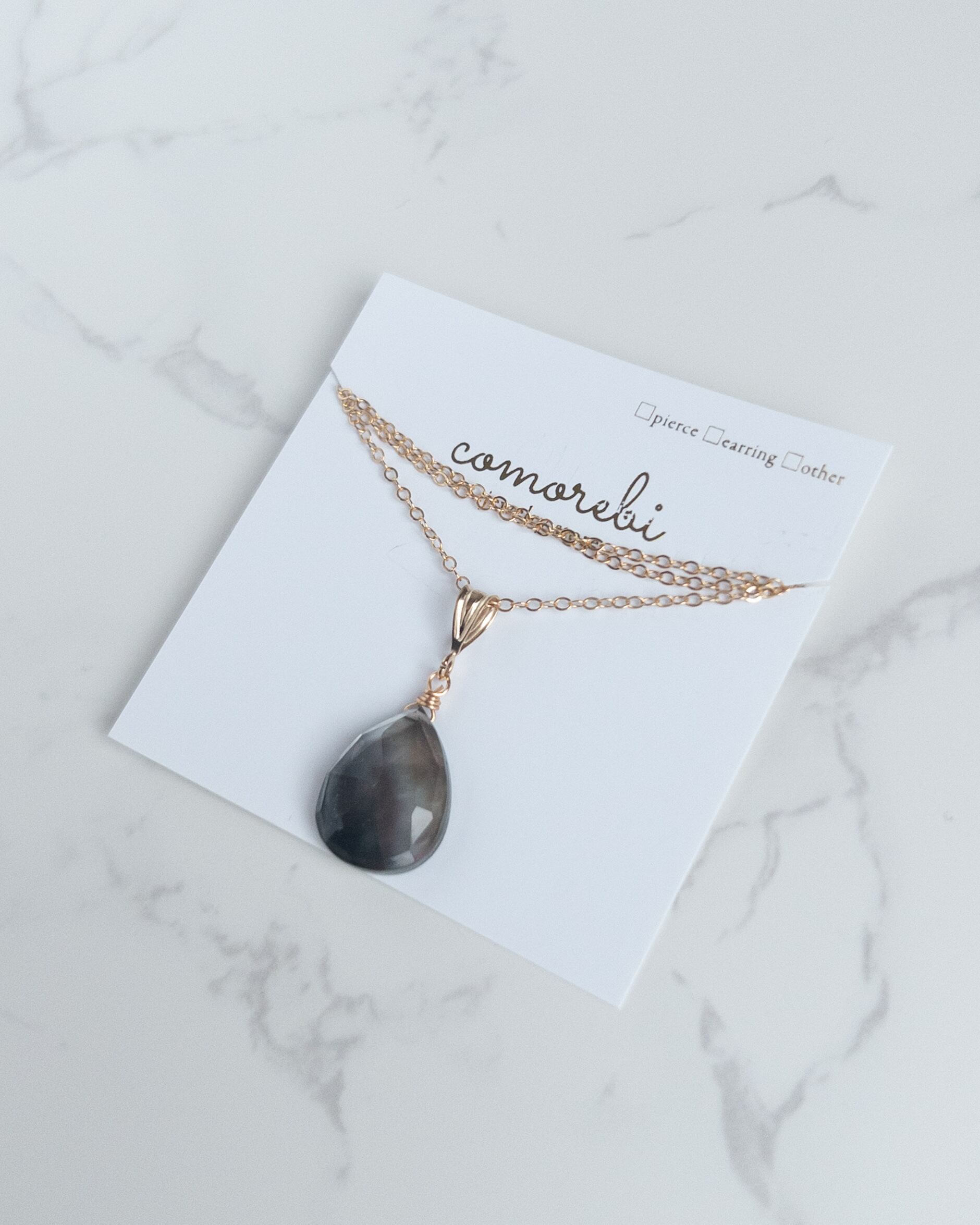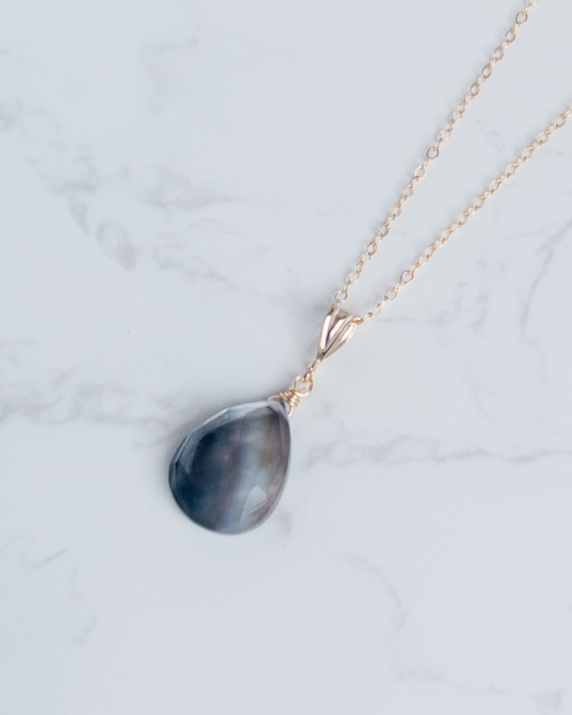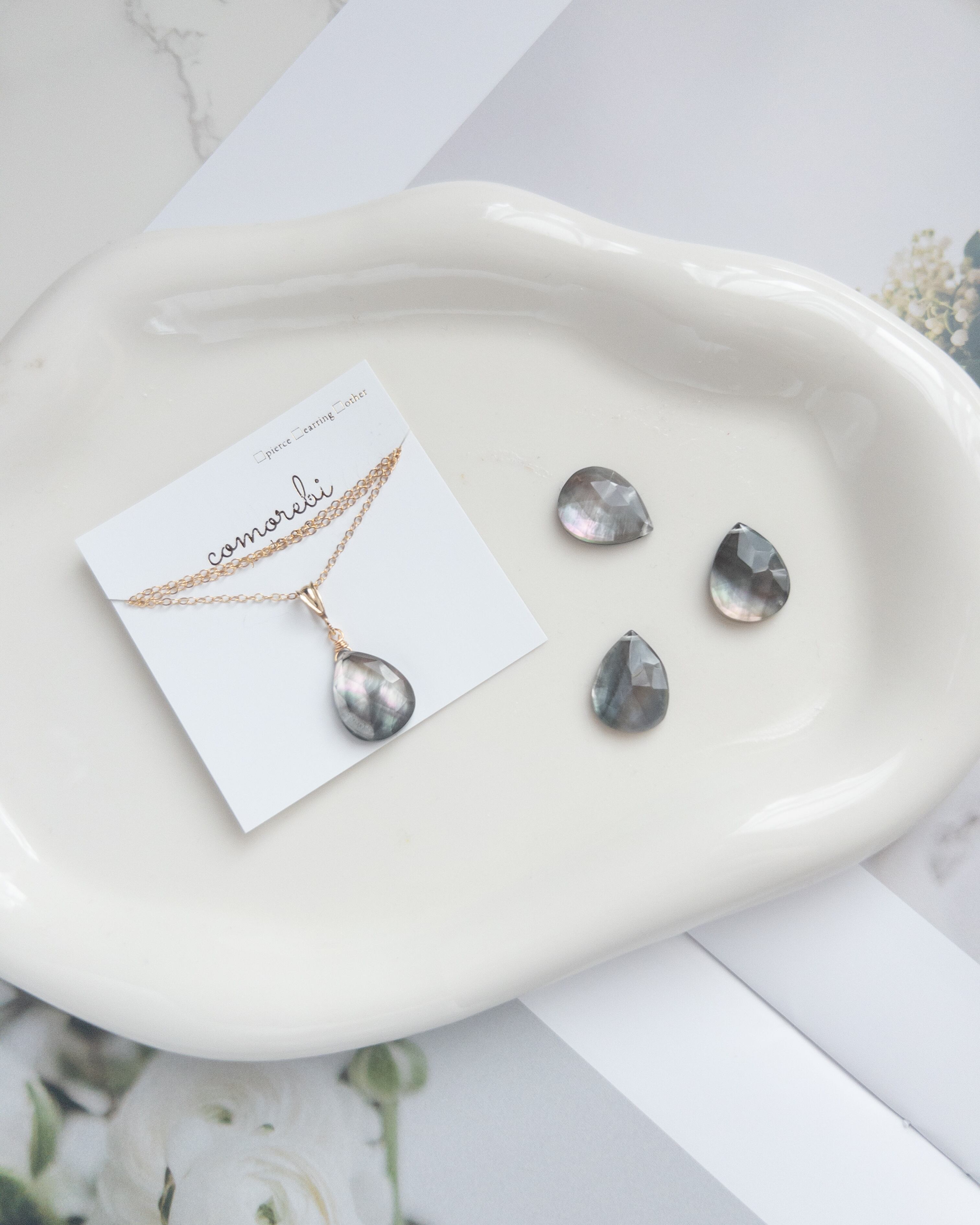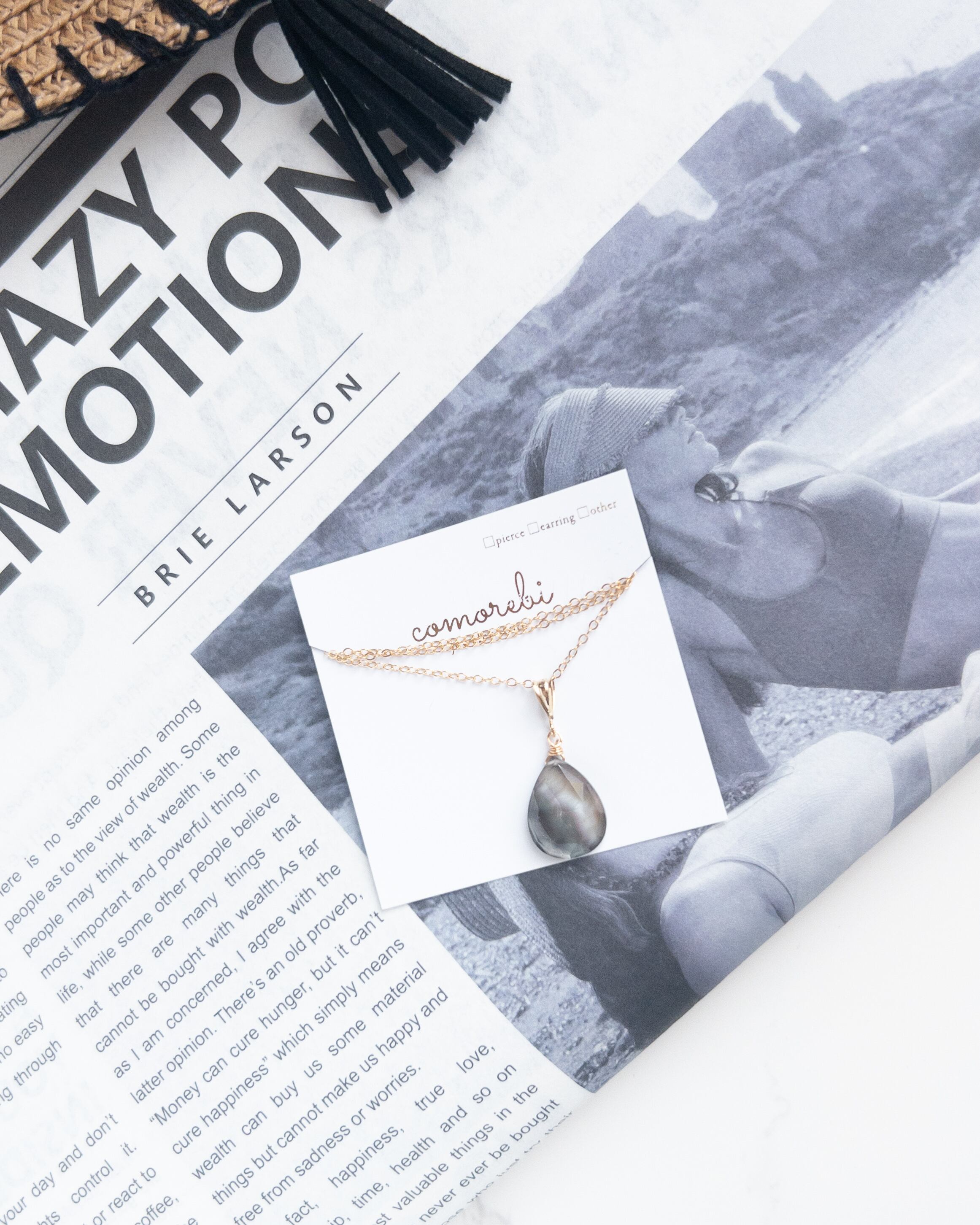 素材 │ ブラックシェル(黒蝶貝)×クリスタル(ダブレット)、14kgfワイヤー、14kgfネックレス