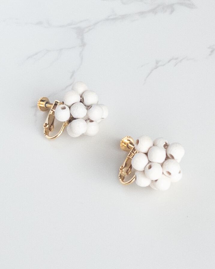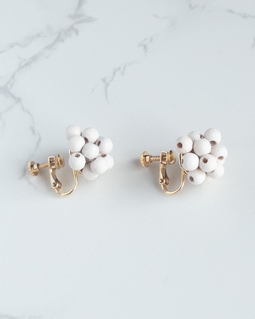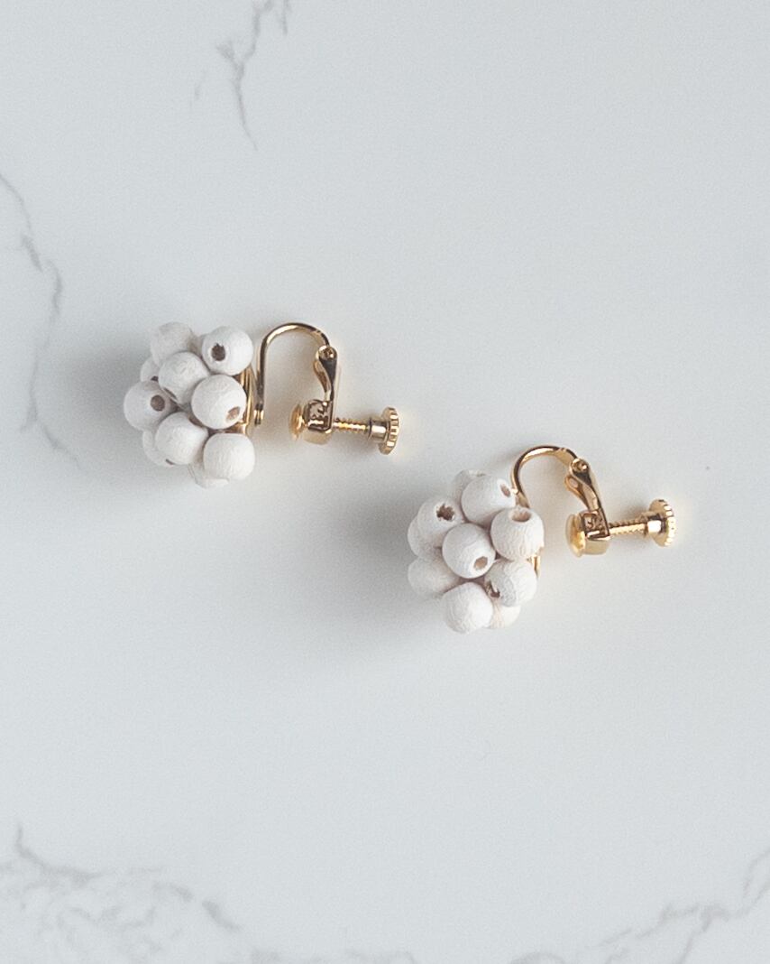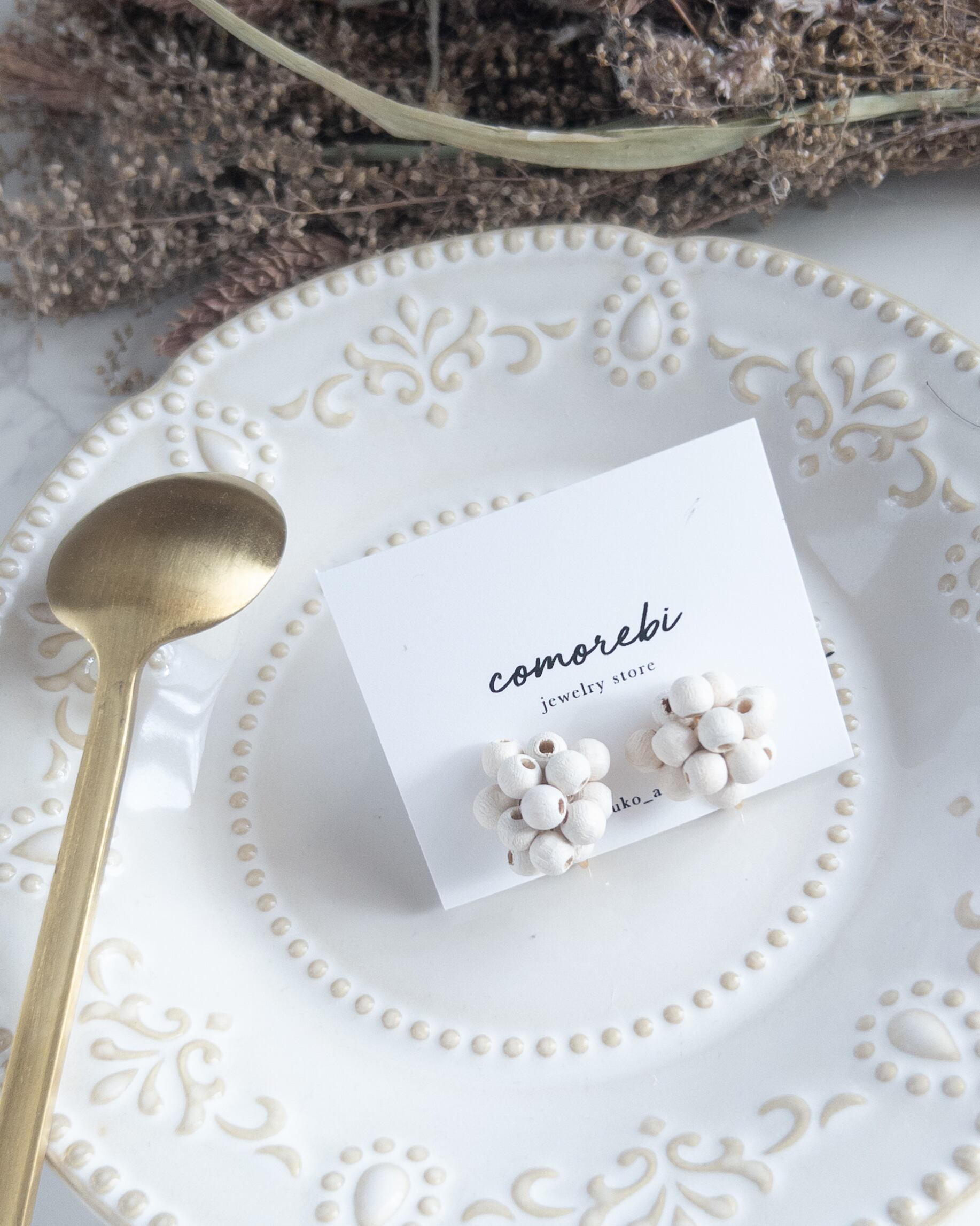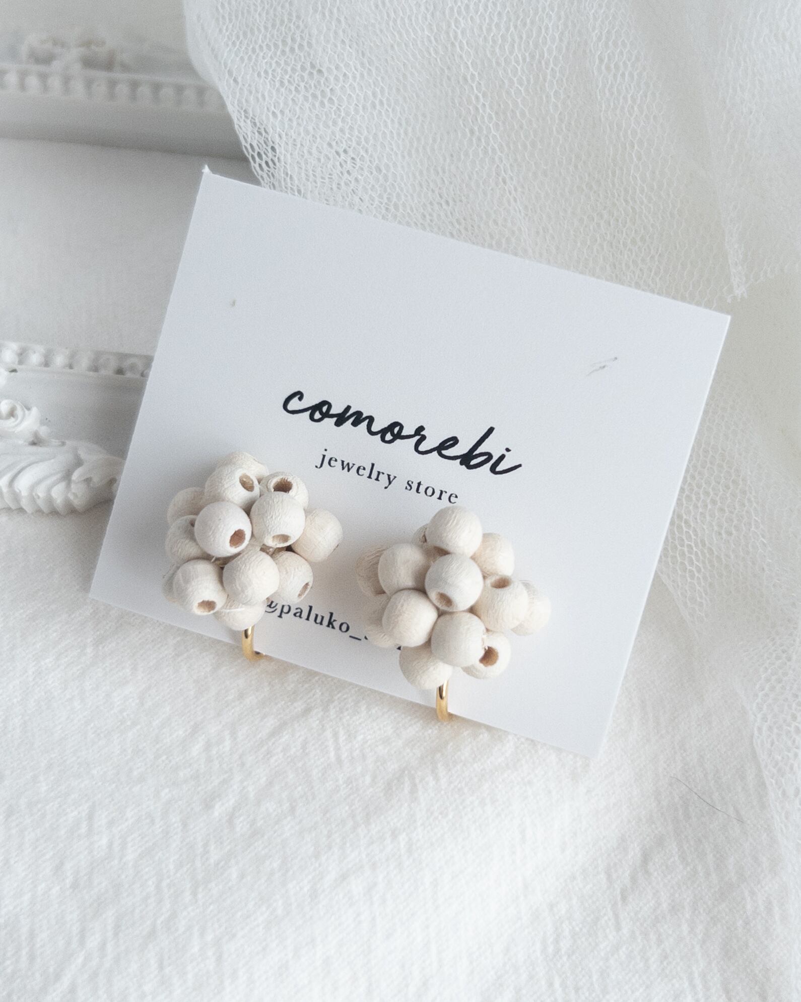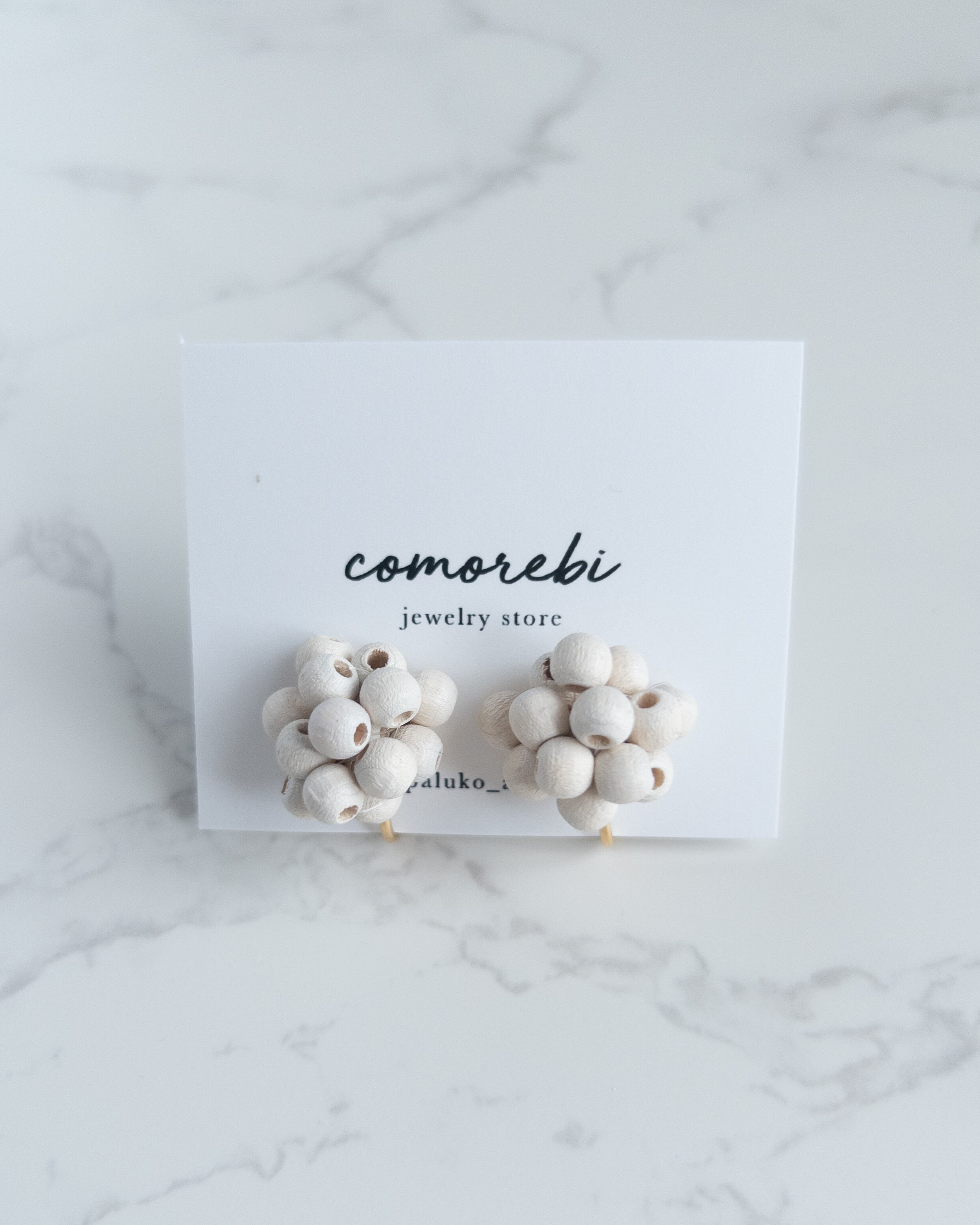 ホワイトウッドビーズをてぐすで編み込みしたナチュラルなイヤリング。