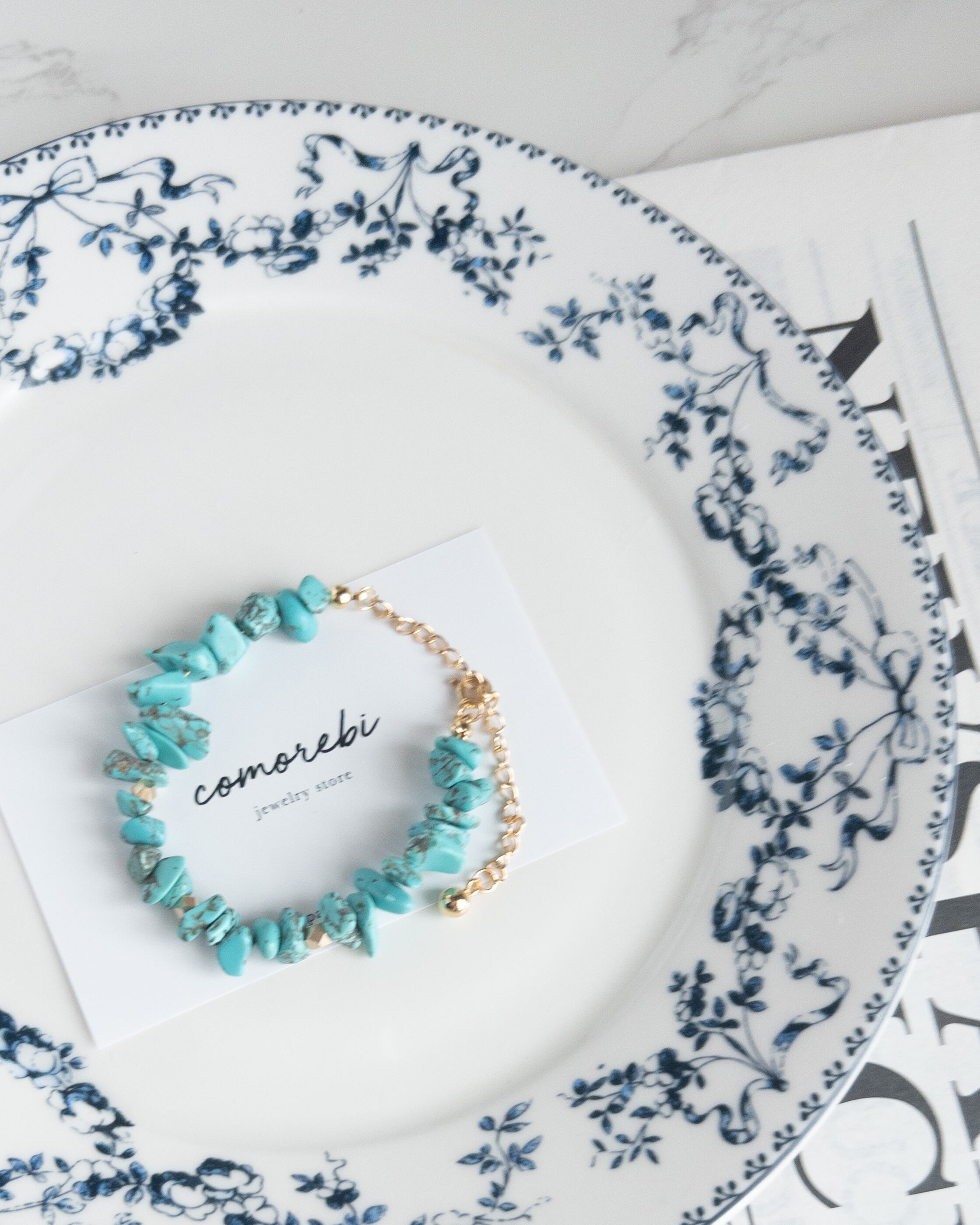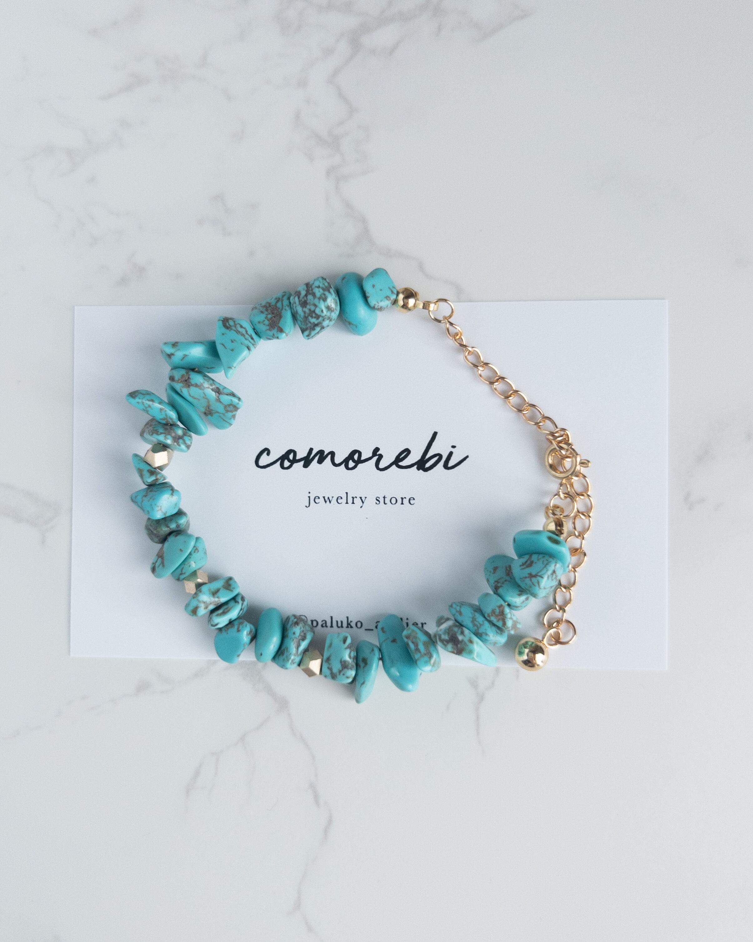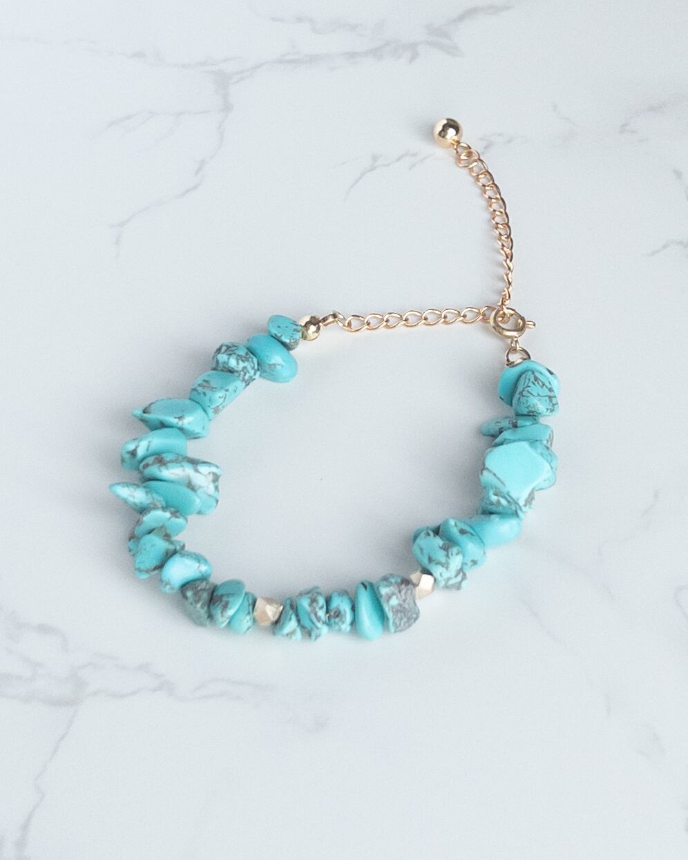 ターコイズビーズとゴールドビーズを使ったステンレス素材のブレスレット。