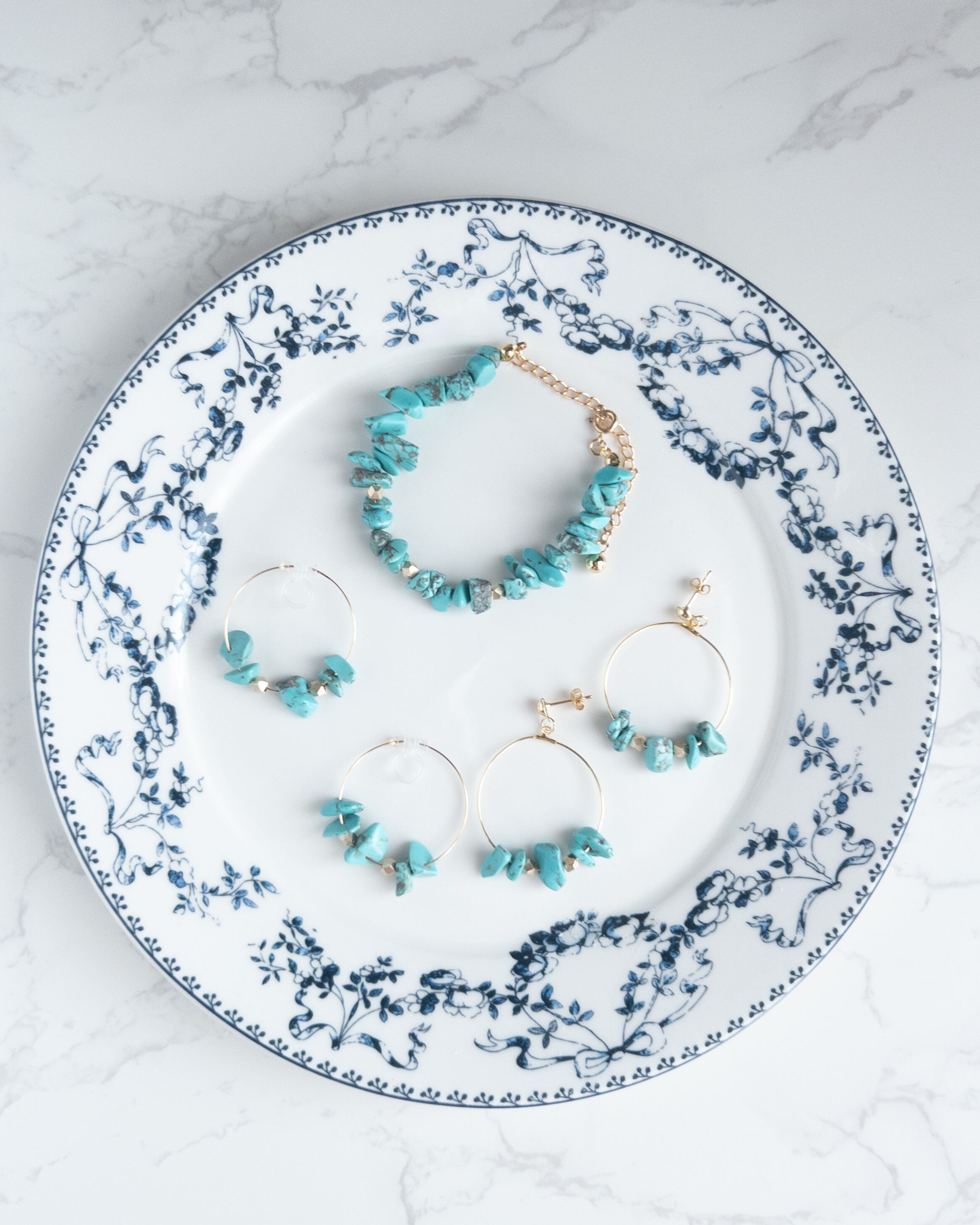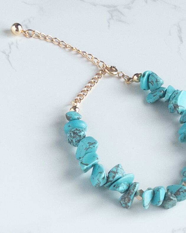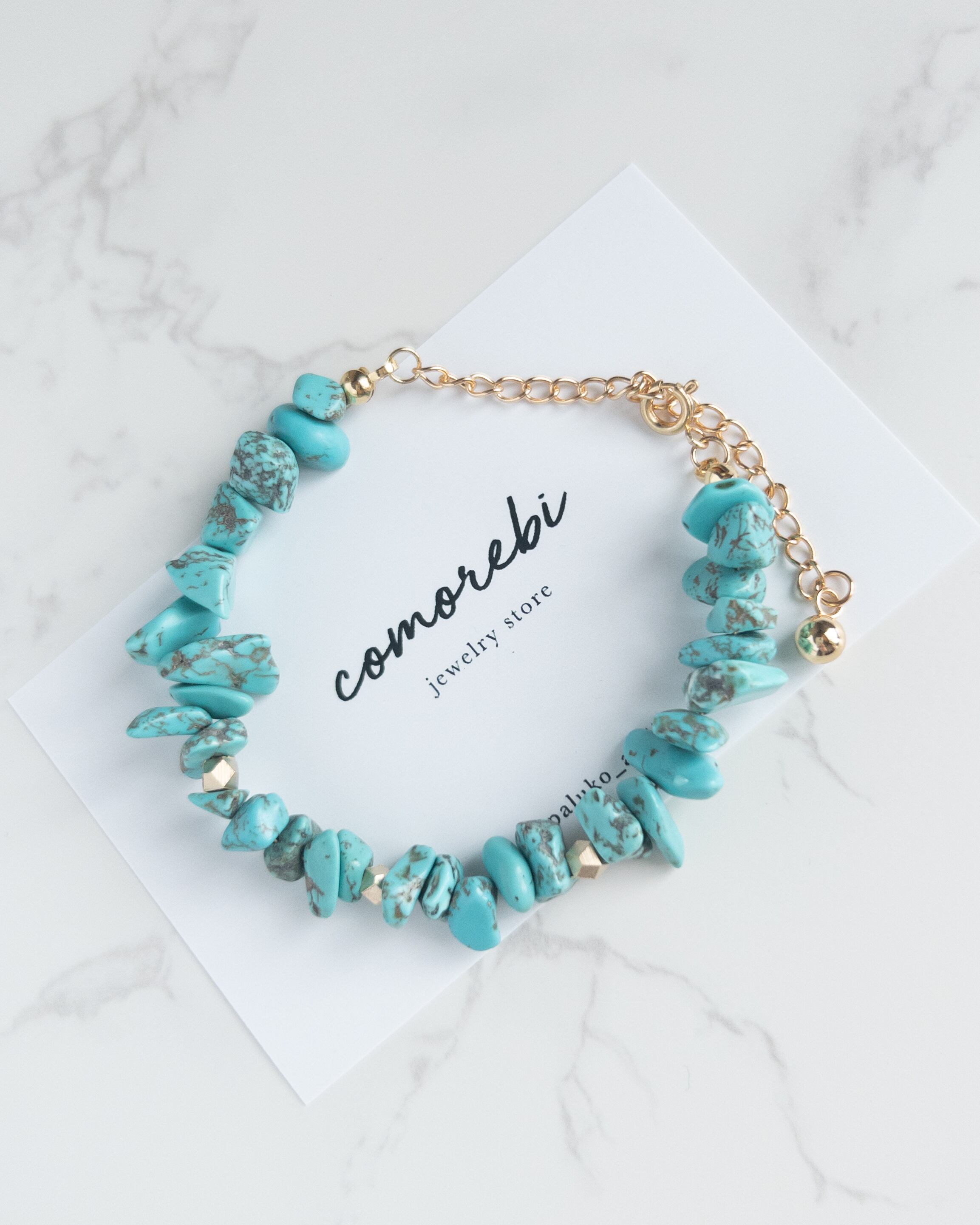 ターコイズビーズとゴールドビーズを使ったステンレス素材のブレスレット。