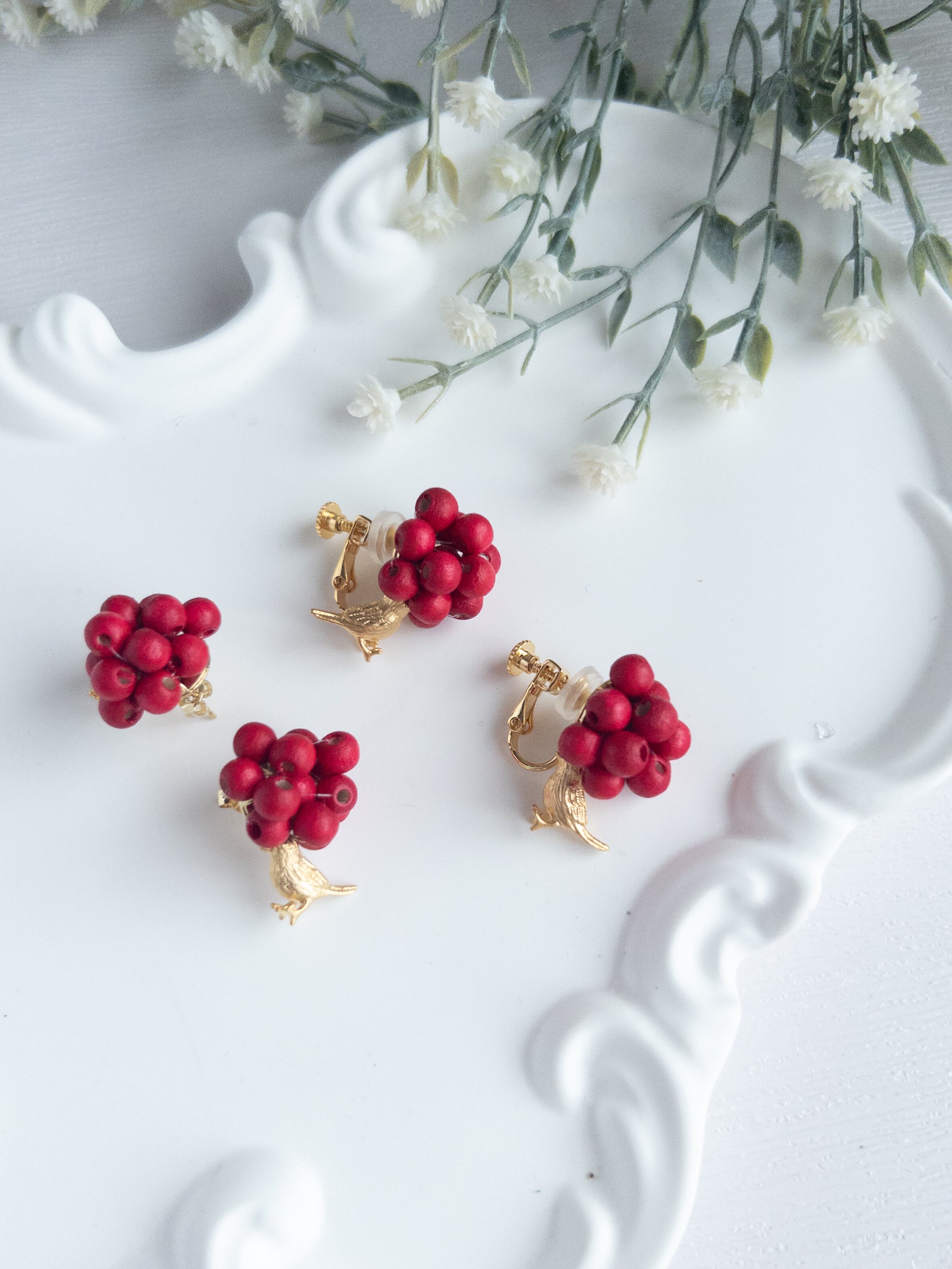 小鳥と赤い木の実のイヤリング 赤ビーズイヤリング レッドビーズイヤリング ウッドビーズイヤリング 秋 冬 ナチュラル