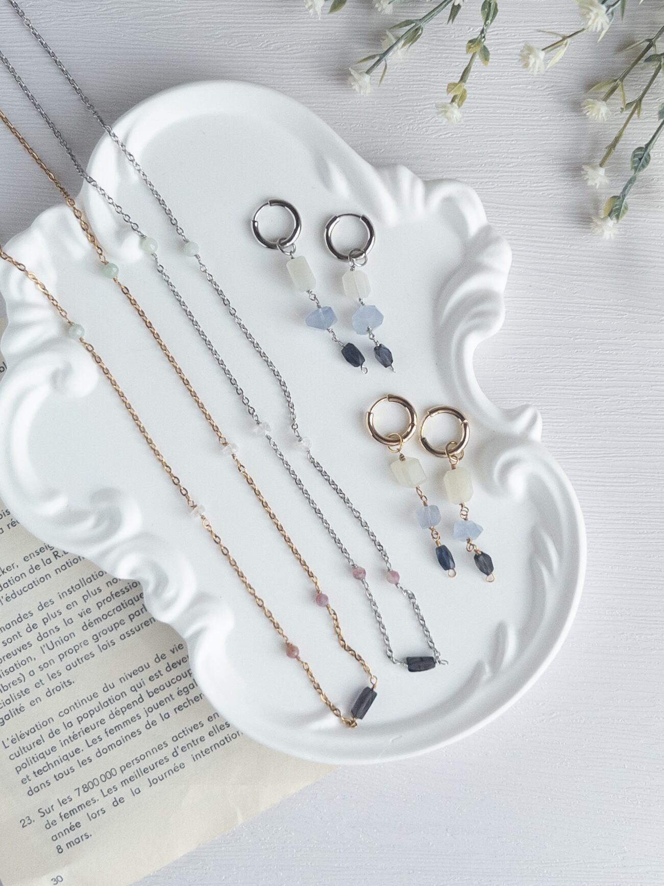 アイオライト、ピンクトルマリン、レインボームーンストーン、翡翠といった天然石が、
