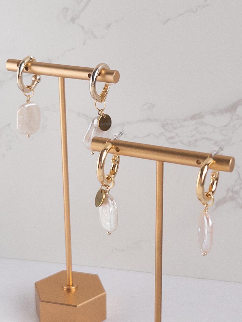 スクエアバロックパールハーフフープピアスは、都会の洗練されたエレガンスを耳元に添える一品です。