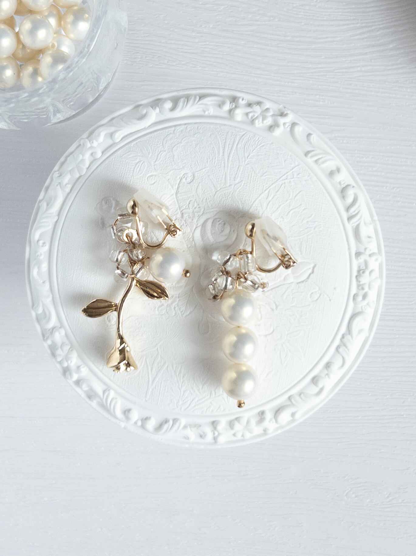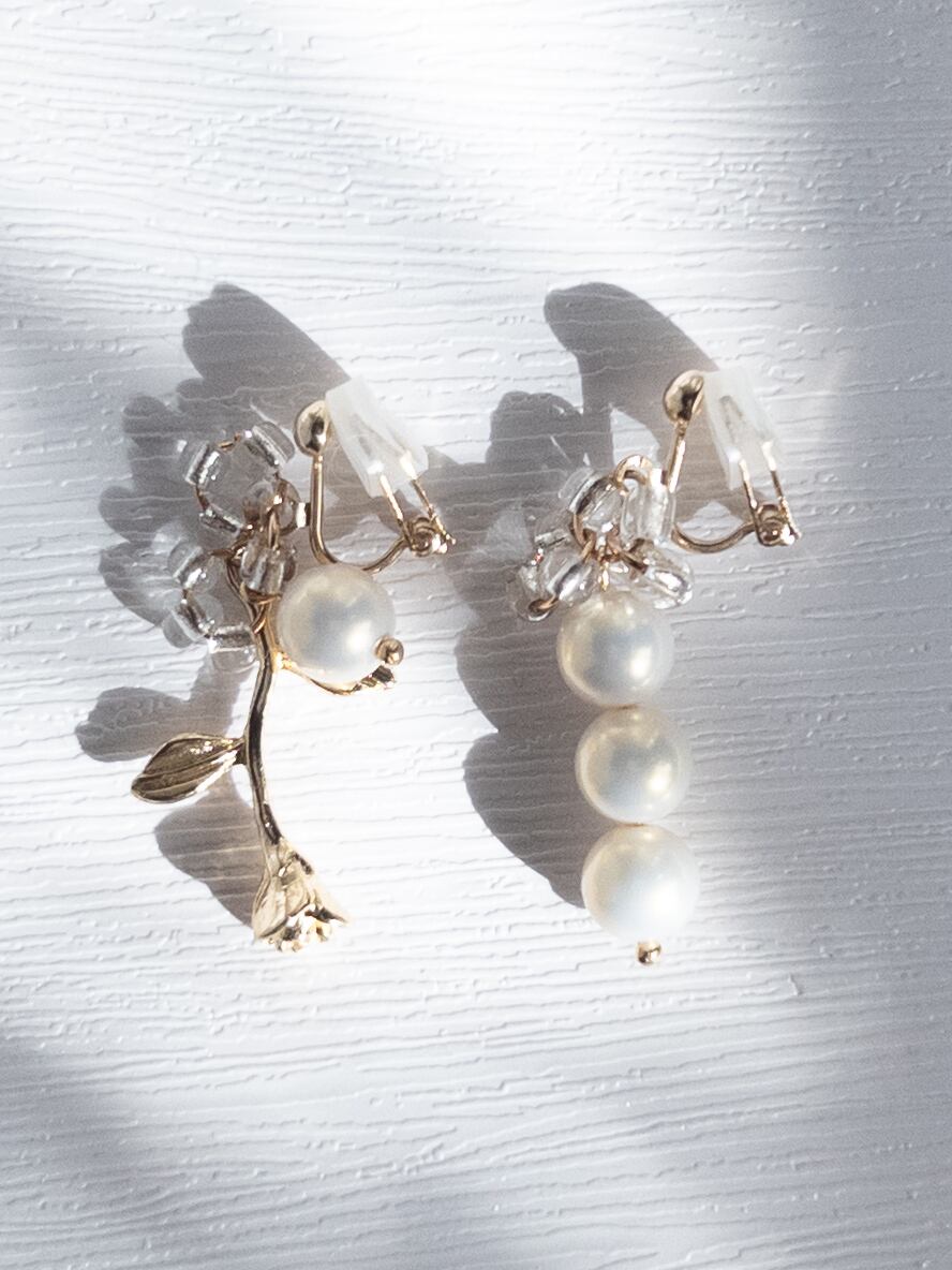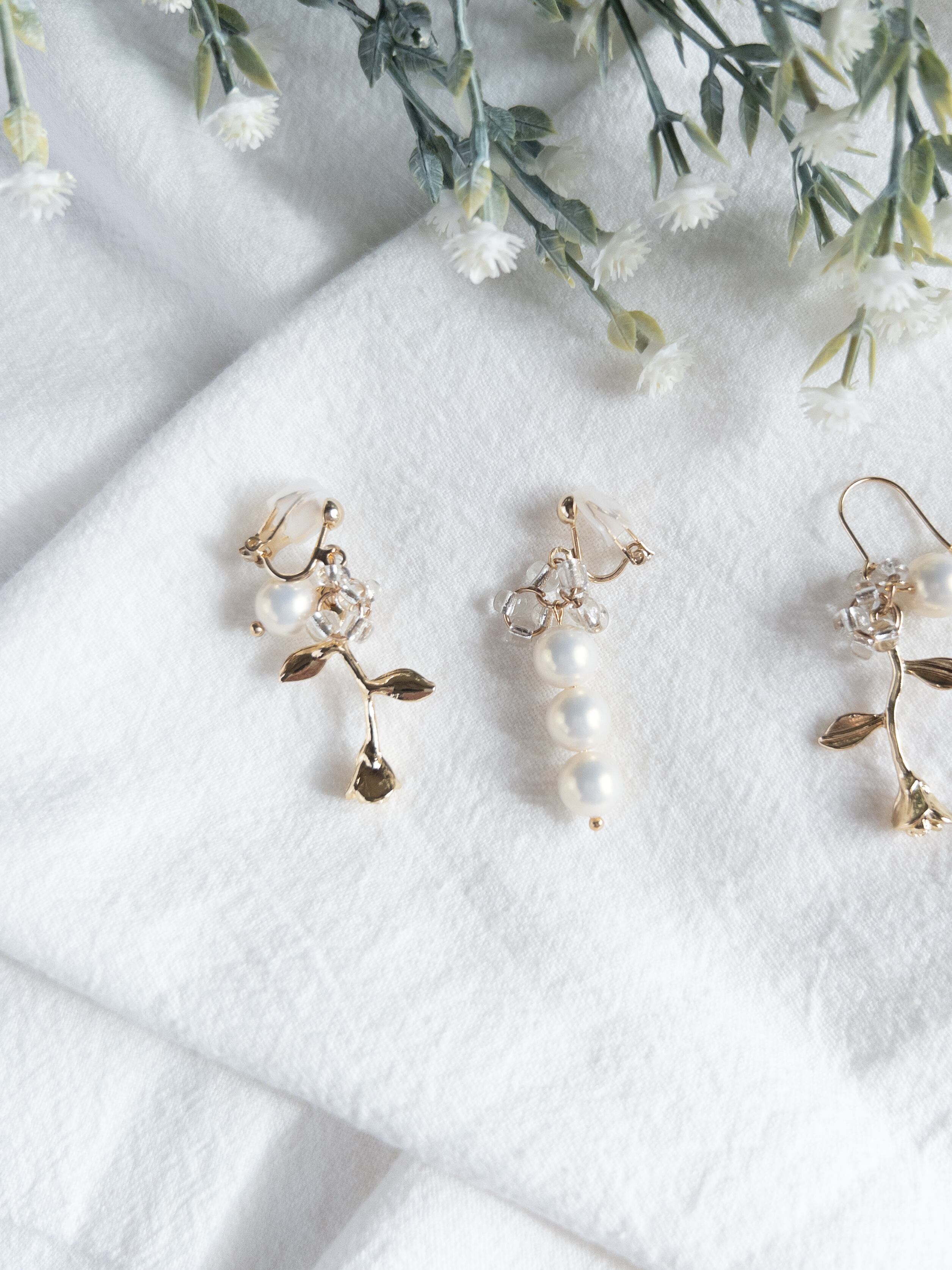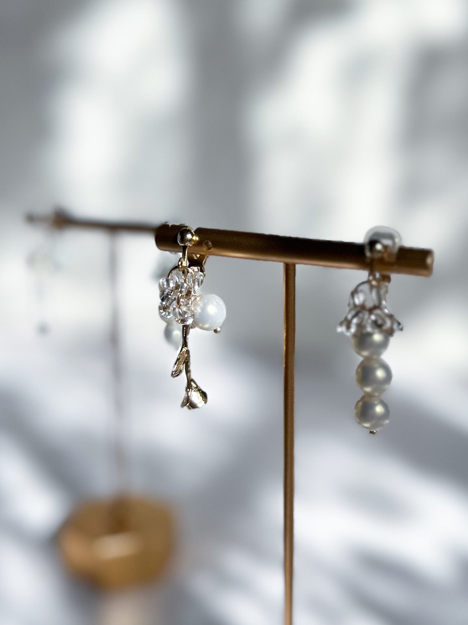 素 材|イヤリング金具:ニッケルフリー、樹脂パール、クリアビーズ、チャーム:合金