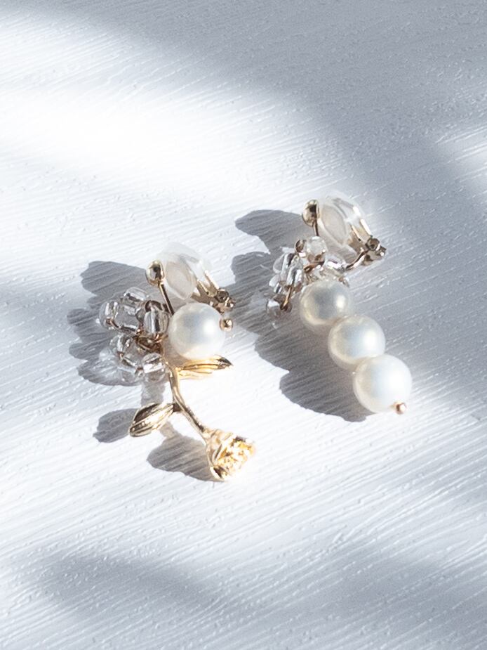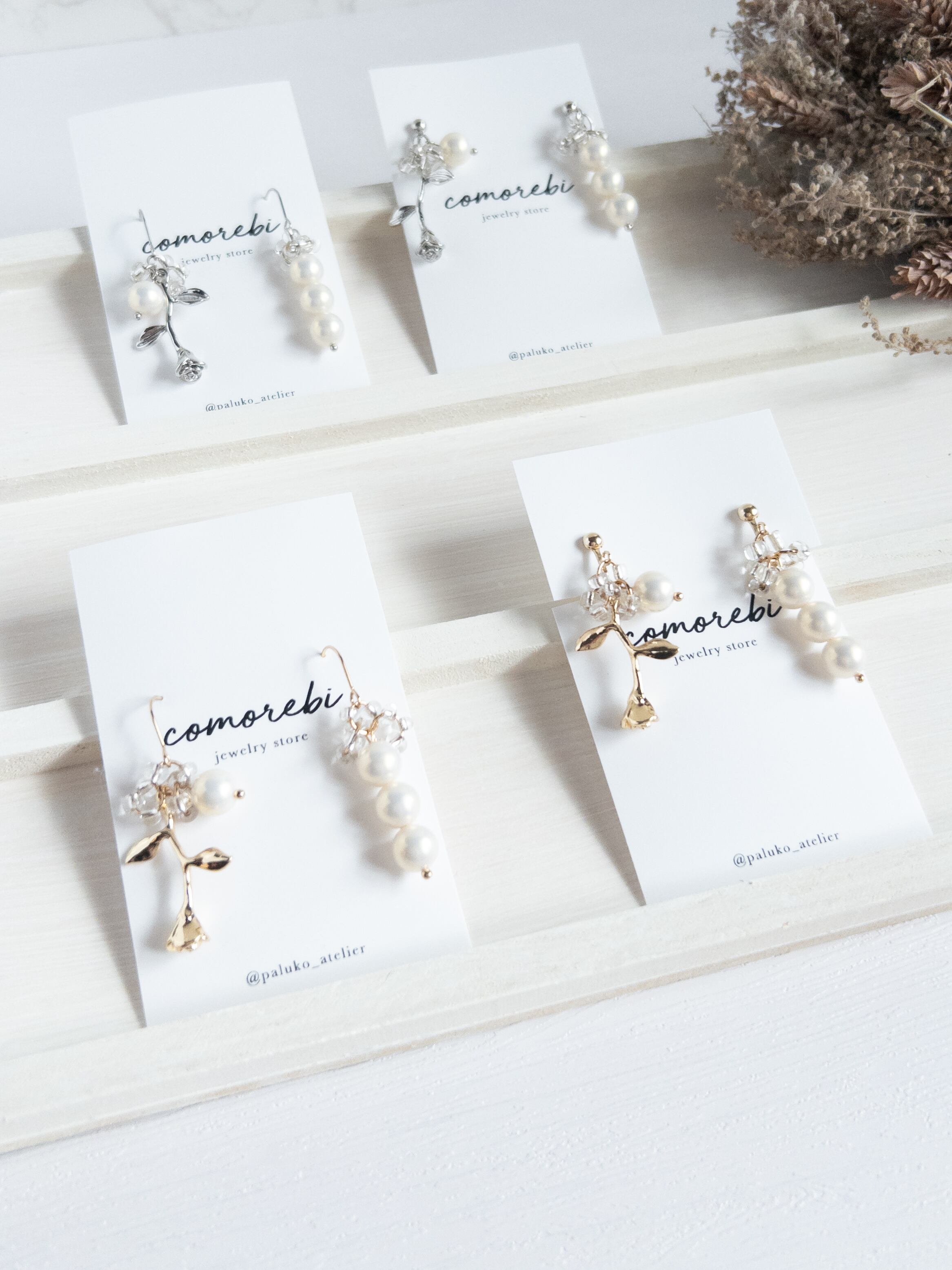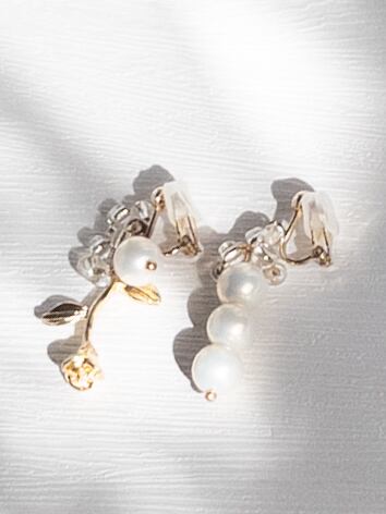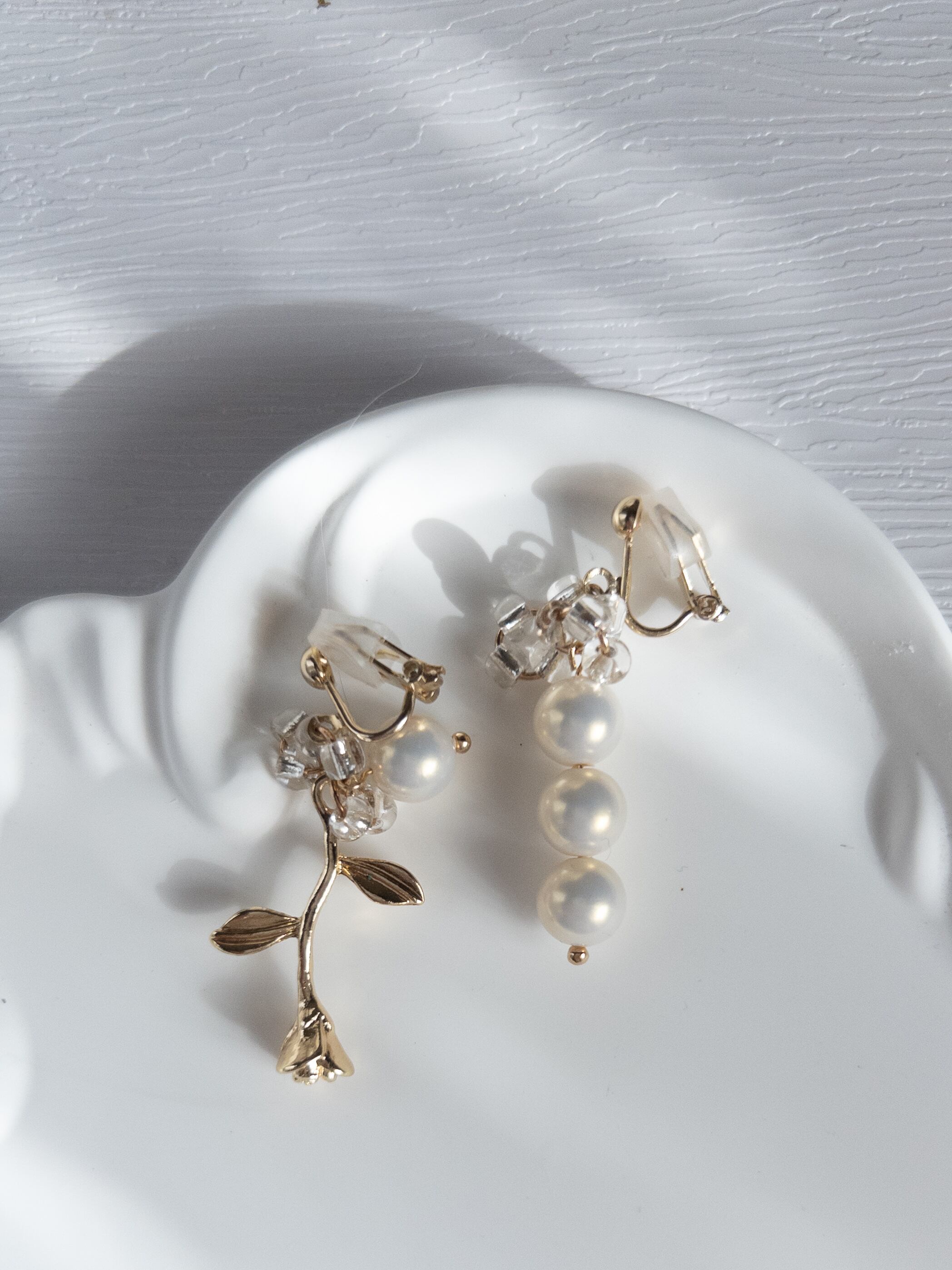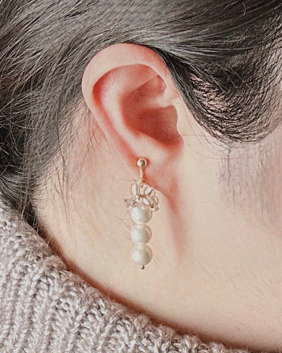 素 材|イヤリング金具:ニッケルフリー、樹脂パール、クリアビーズ、チャーム:合金