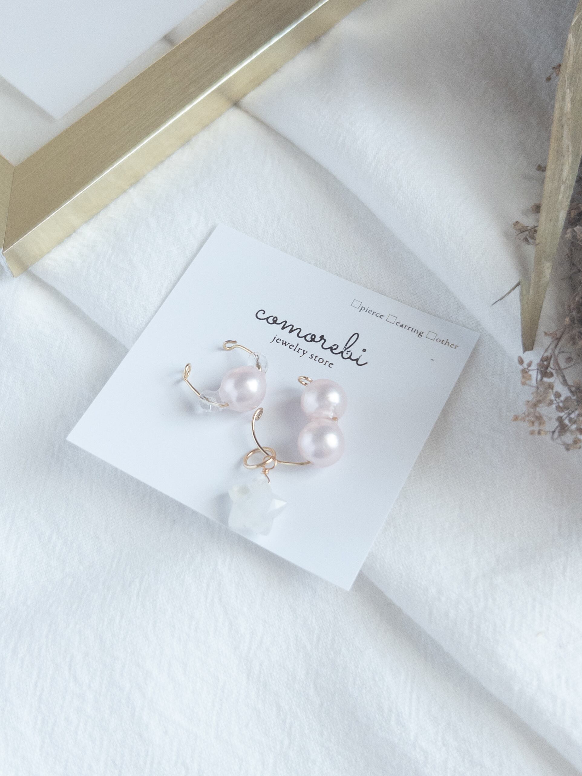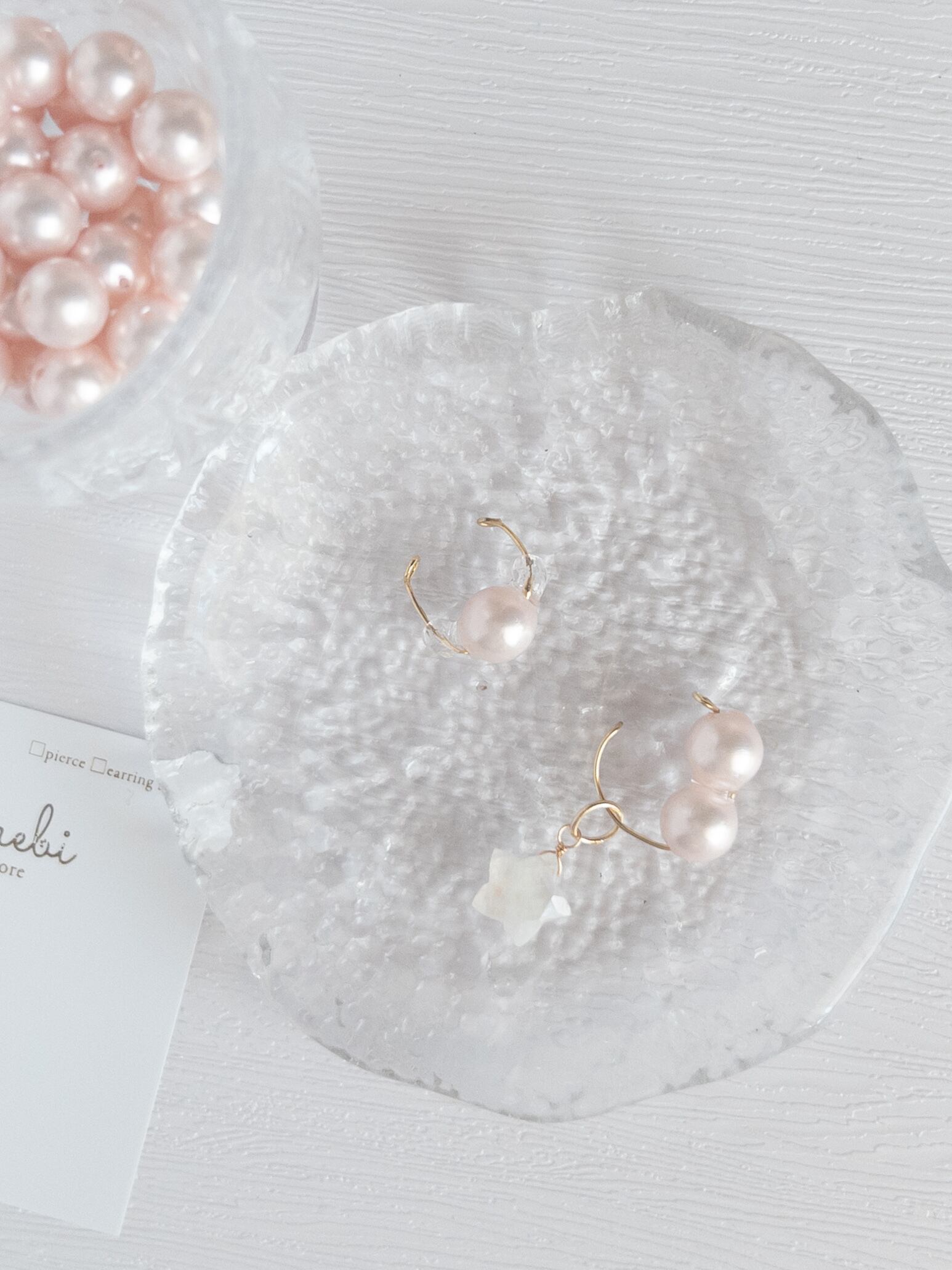 ピンクのシルキーパールが可愛らしく輝き、クリアビーズと組み合わせたデザインは