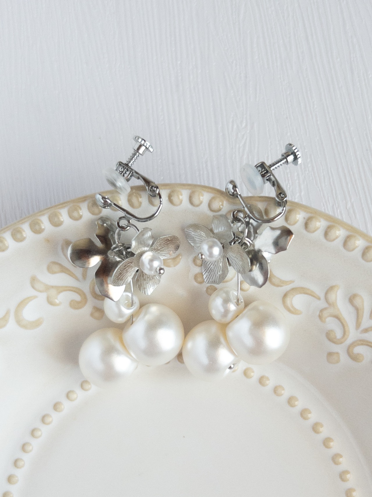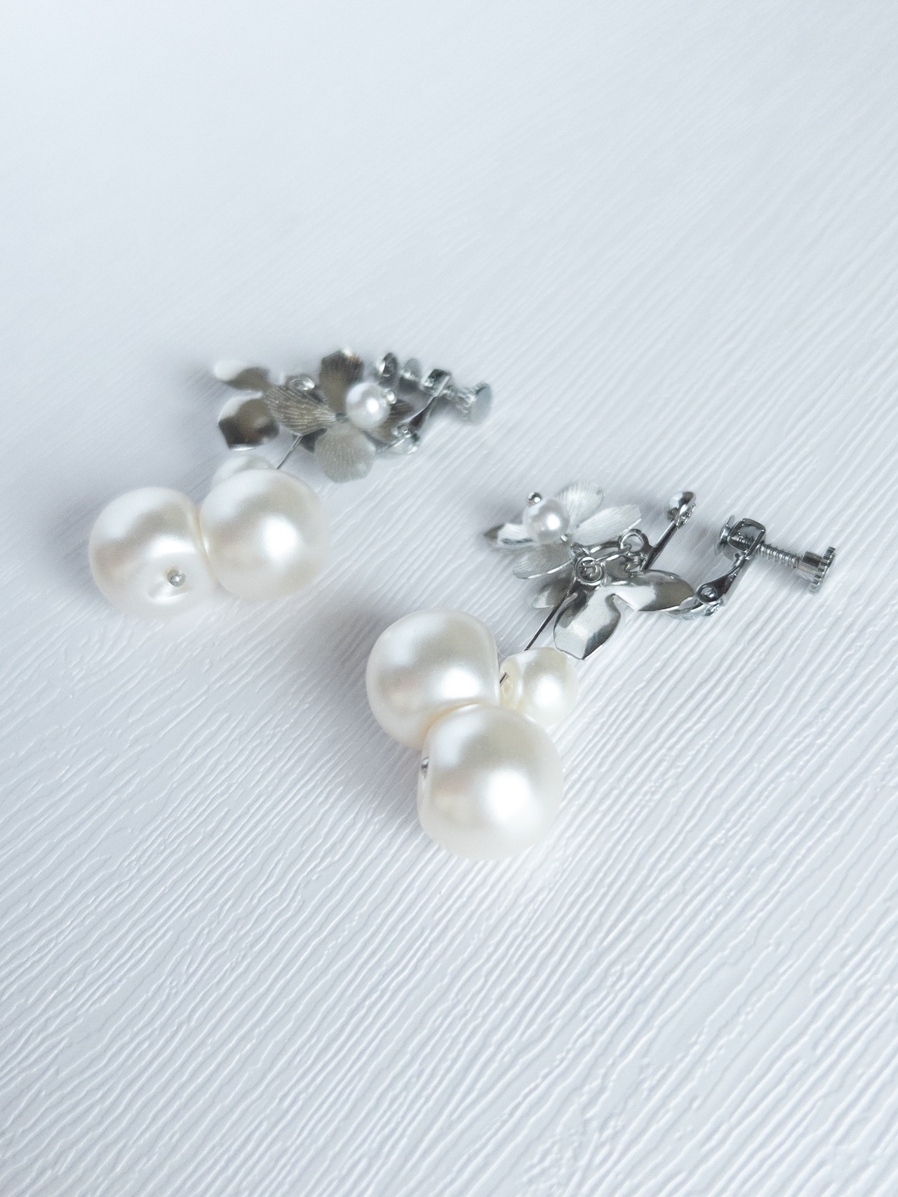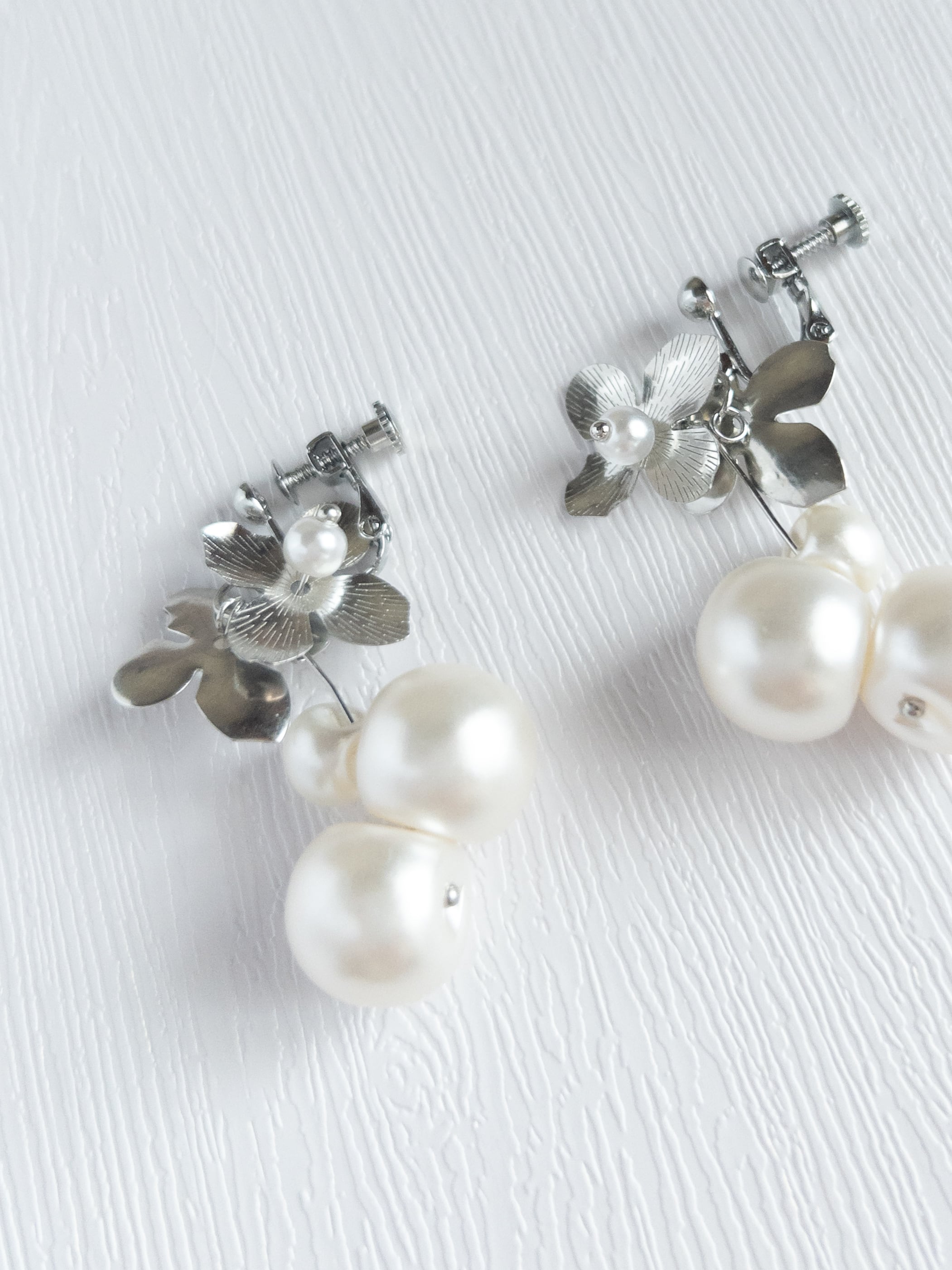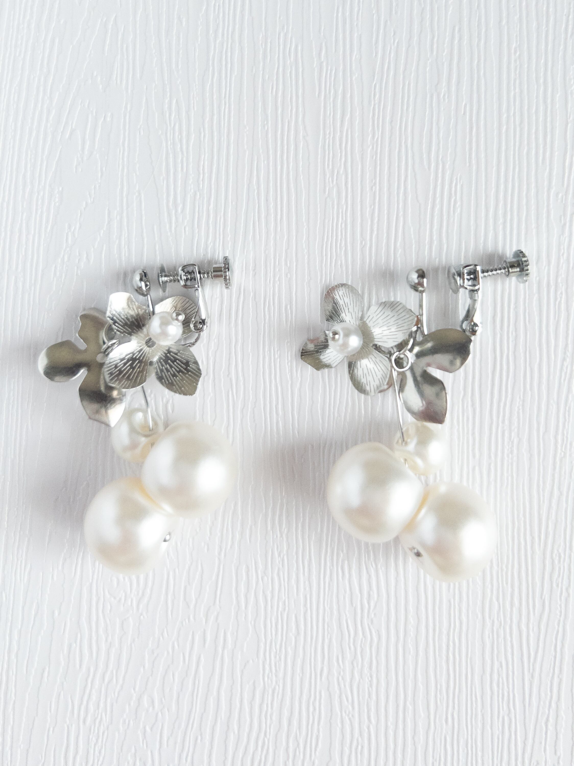 白銀の世界〜フラワーパールピアス 金属アレルギー対応 チタンピアス 鈴丸パールピアス メタルフラワーピアス デイリー フォーマル お仕事