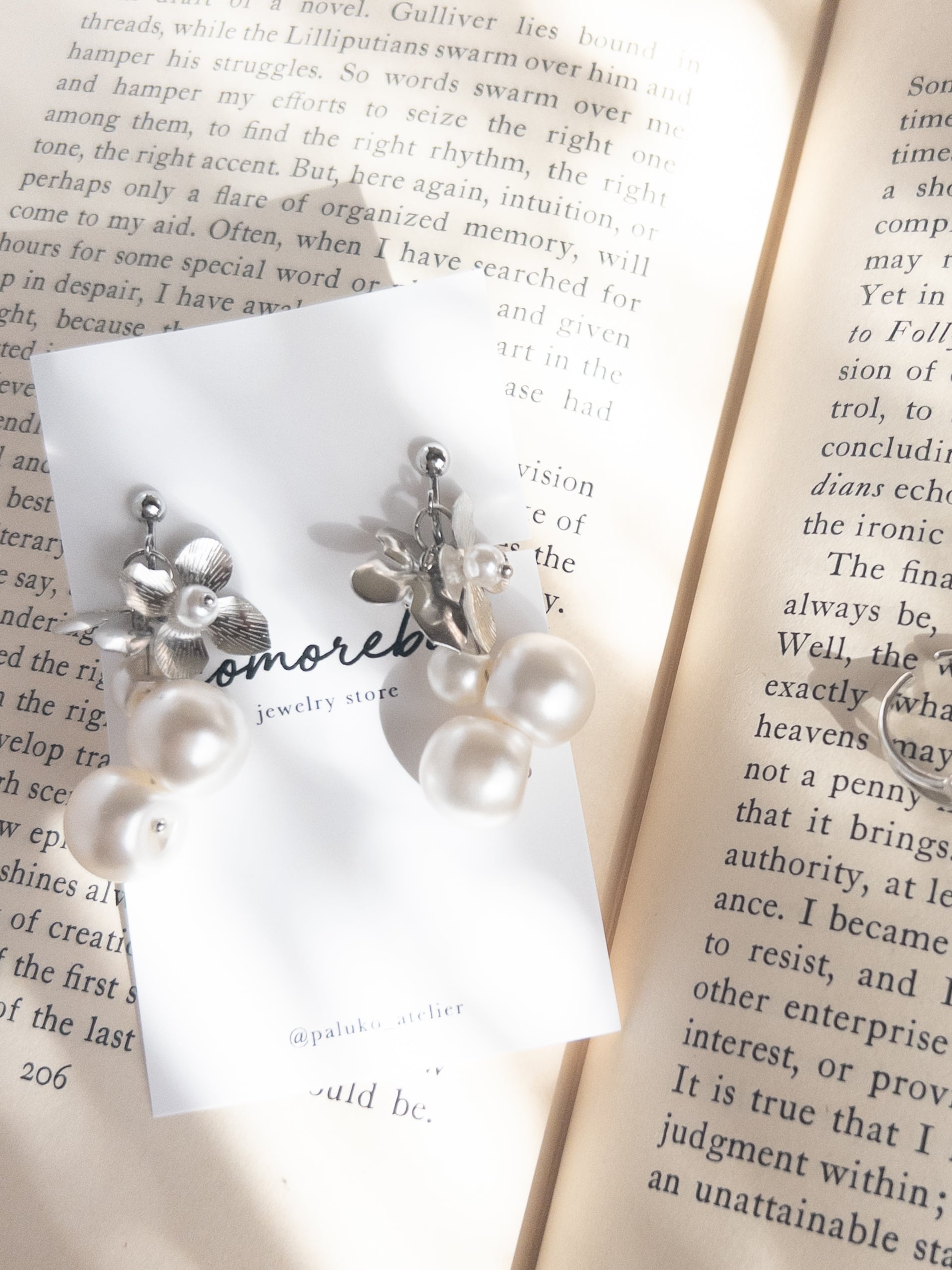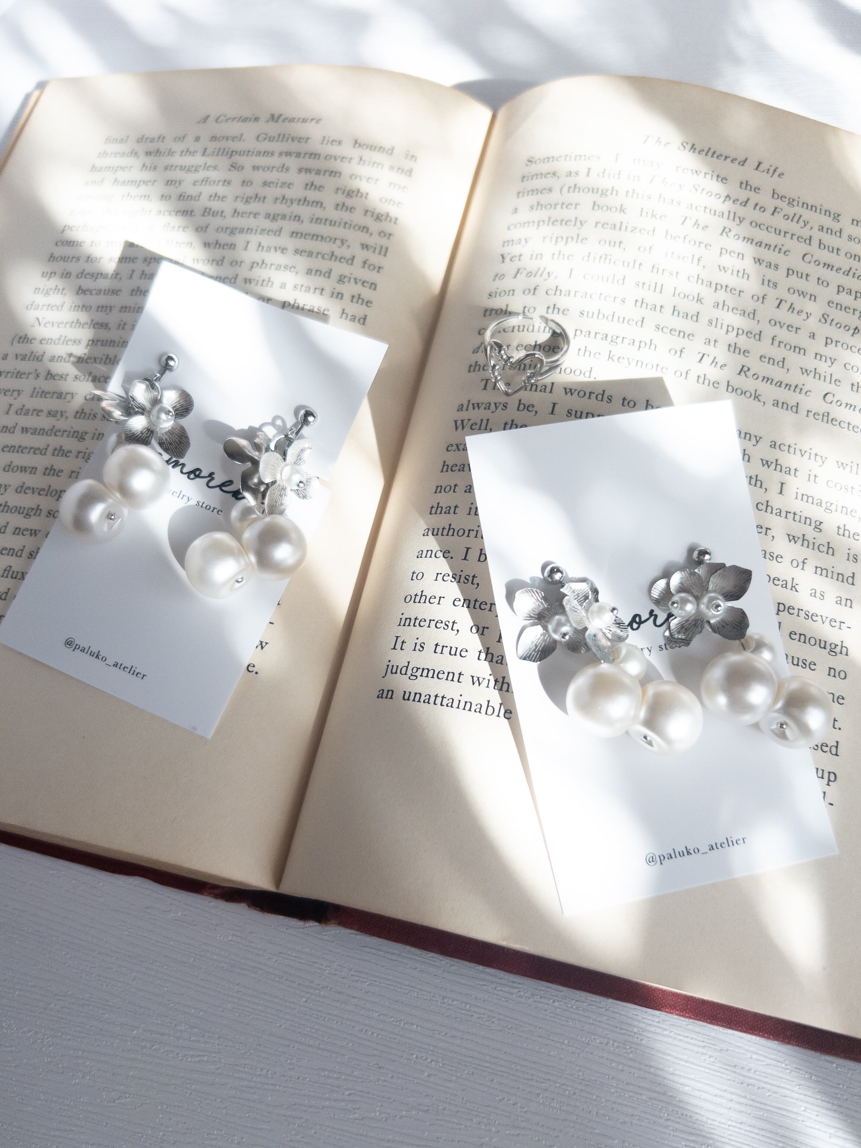 大小粒のスズマルパールにメタルフラワーを輝かせたアクセサリー