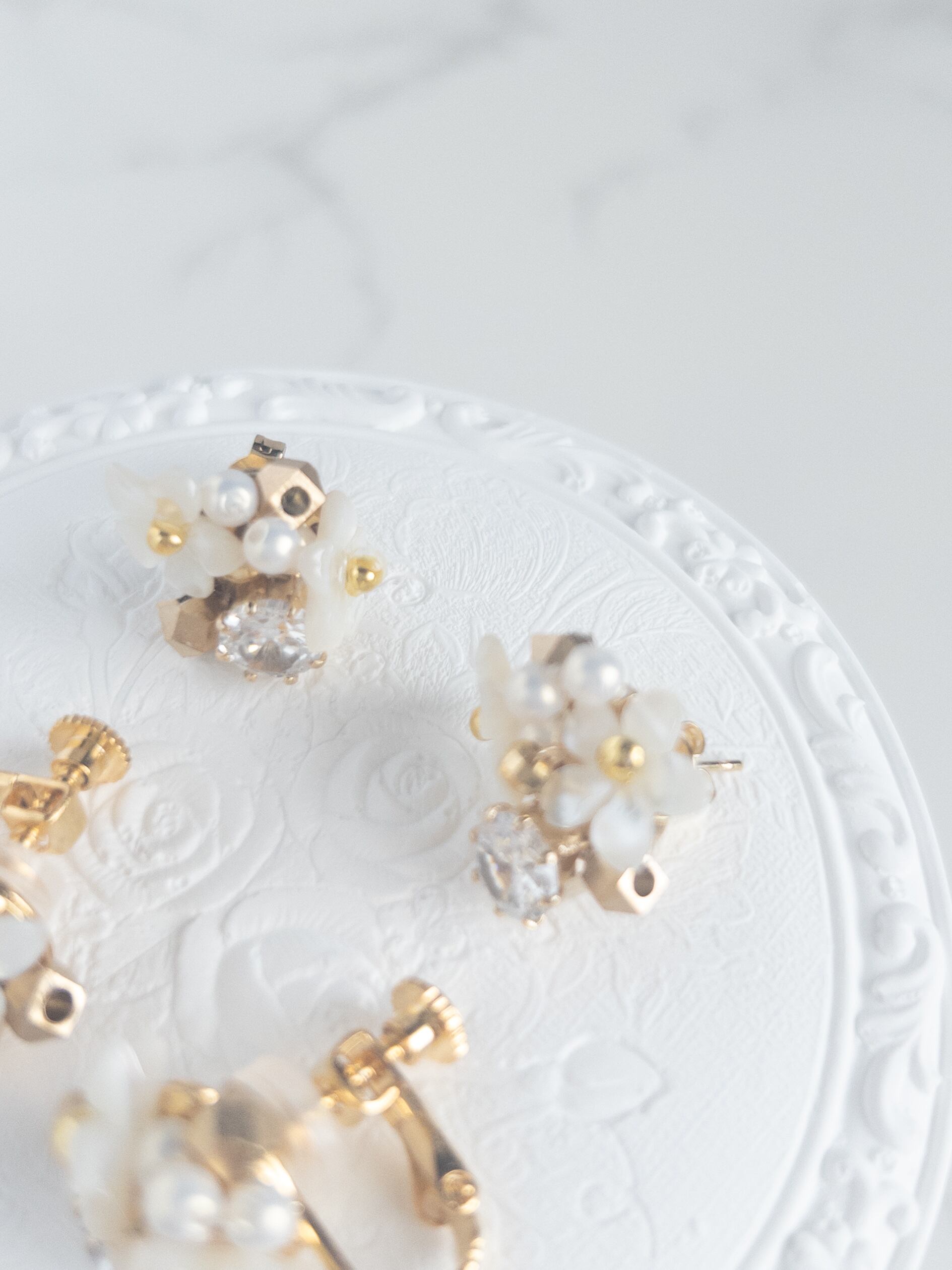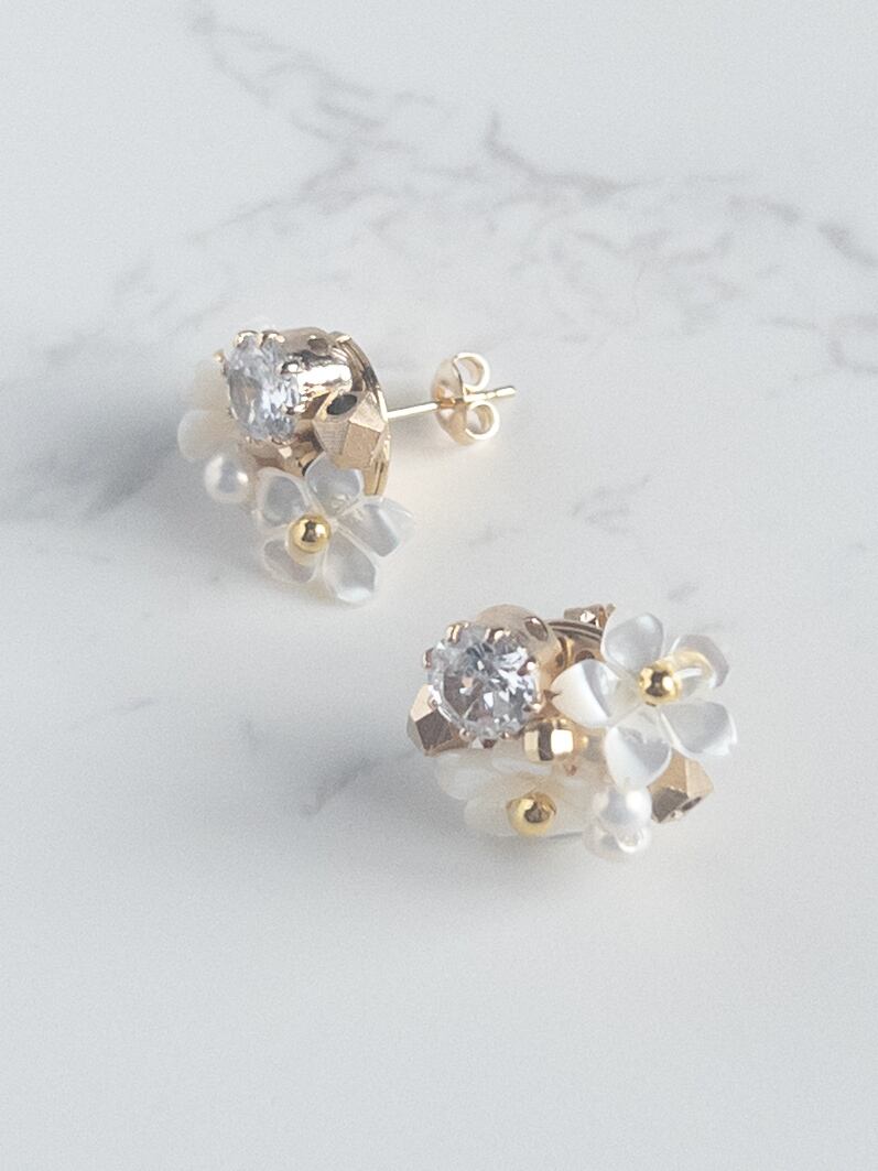 ホワイトシェルフラワージルコンピアス フォーマル デイリー