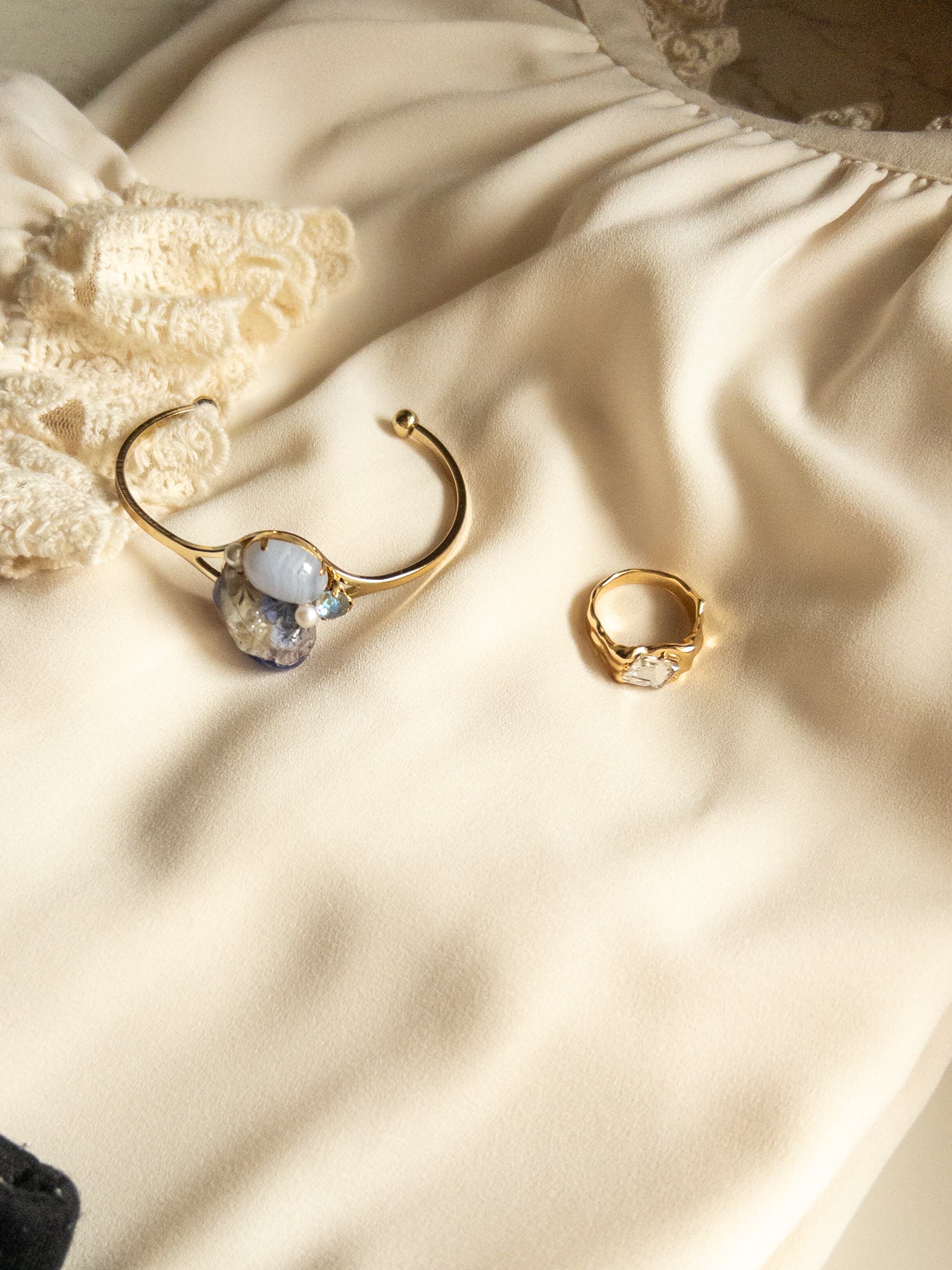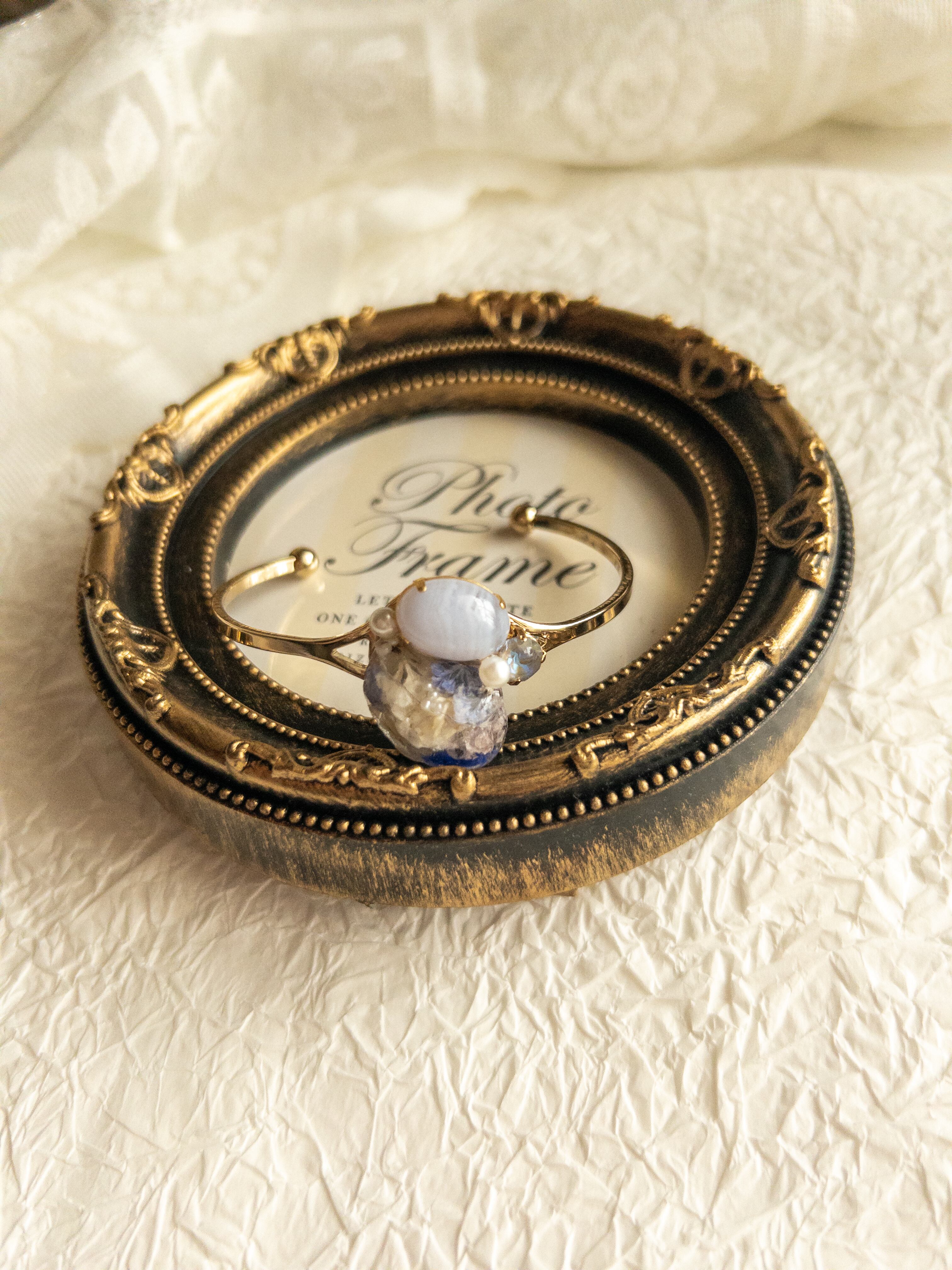 石座に天然石ブルーレースと小粒のパールやクリスタルビジューを乗せ、